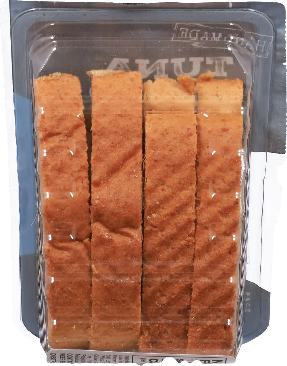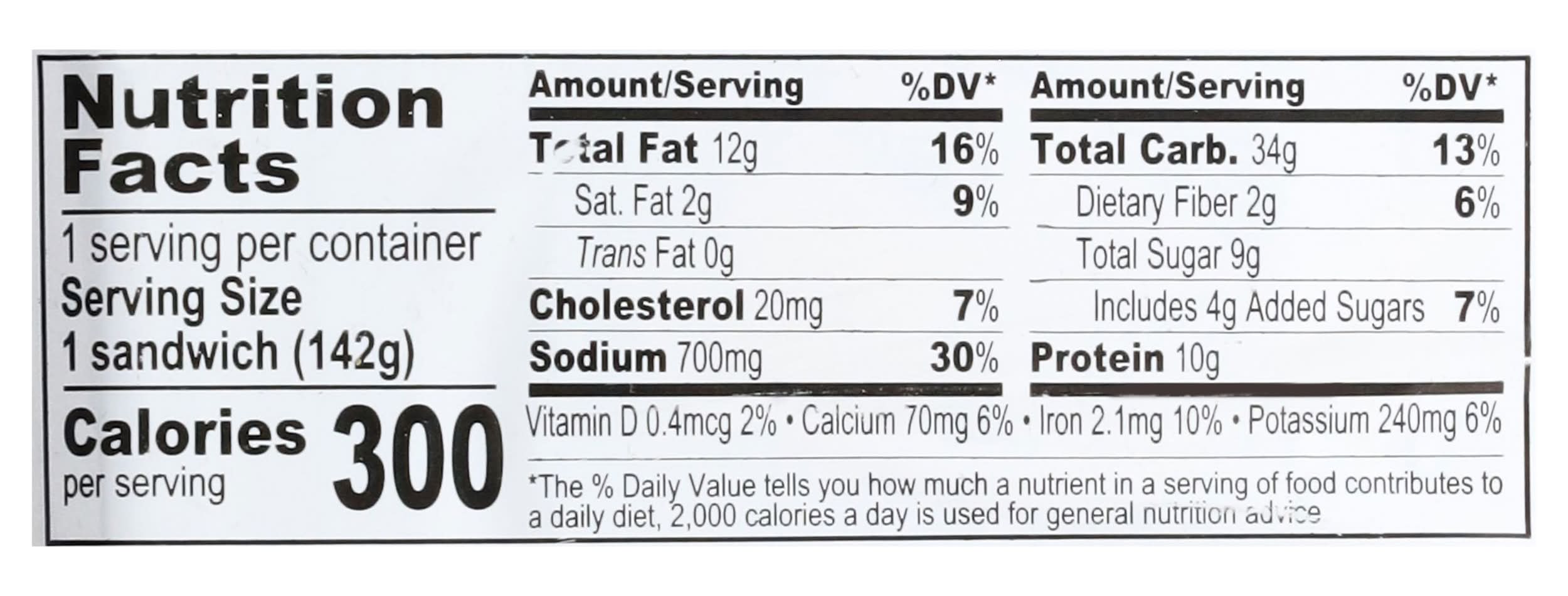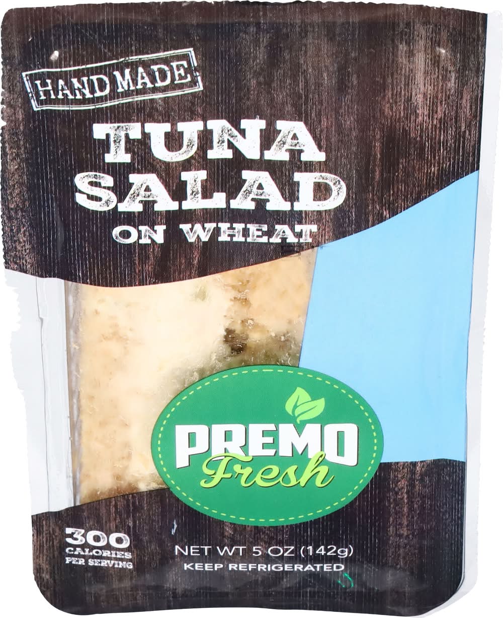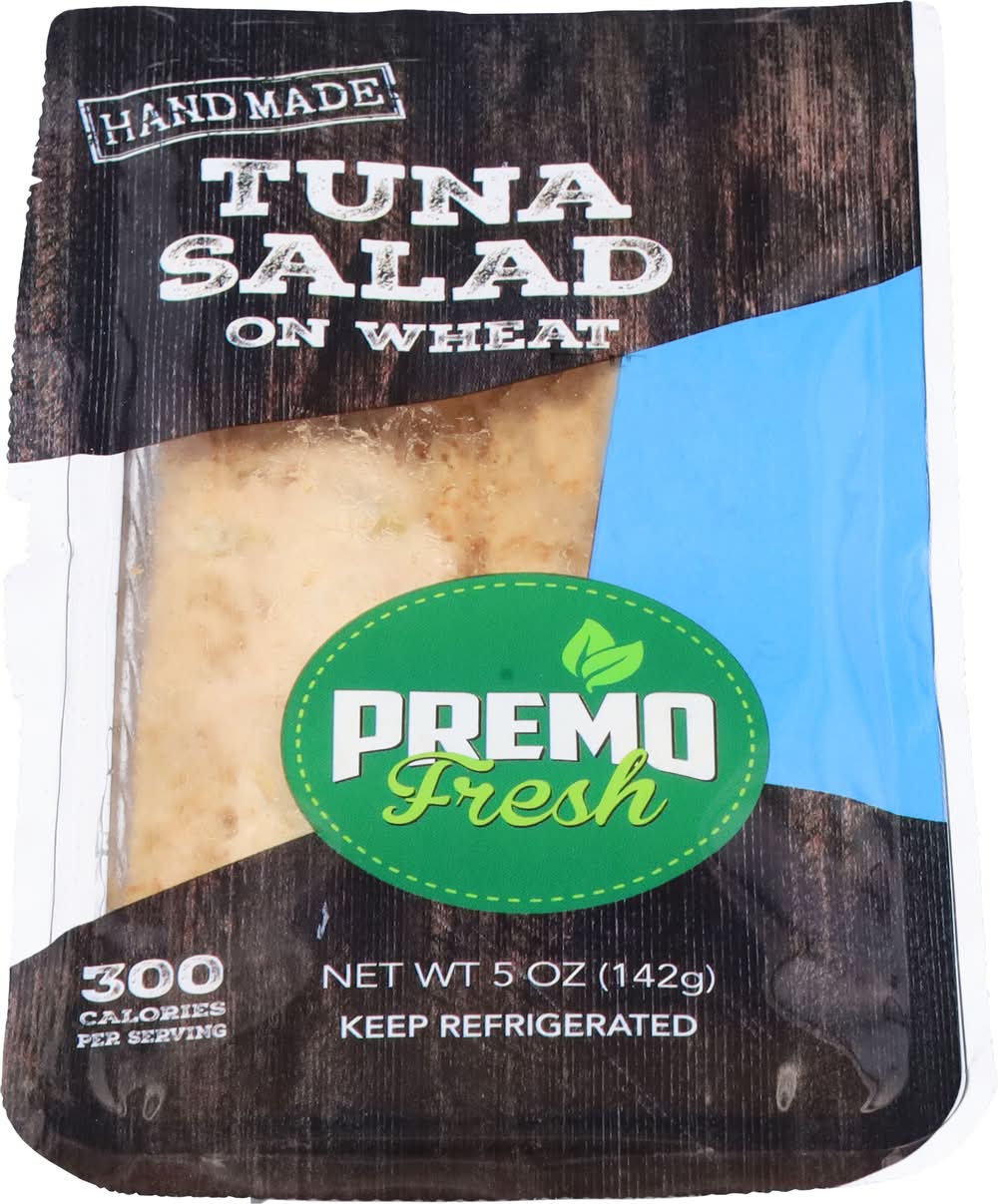 Ingredients: Tuna Salad [Tuna (Light Tuna, Water, Vegetable Broth, Salt), Salad Dressing (Soybean Oil, Water, Vinegar, Sugar, Egg Yolks, Modified Food Starch, Contains Less than 2% of Salt, Mustard Flour, Spice, Paprika, Natural Flavor, Dried Garlic), Celery, Pickle Relish (Cucumbers, Cane Sugar, Distilled Vinegar, Salt, Xanthan Gum, Red Peppers, Mustard Seed, Natural Flavors, Oleoresin Turmeric, Calcium Chloride), Bread Crumbs (Bleached Wheat Flour, Sugar, Yeast, Salt), Onion, Contains 2% or Less Sugar, Salt, Lemon Juice Concentrate, Distilled Vinegar, Potassium Sorbate and Sodium Benzoate (Preservatives), Glucono Delta Lactone], Wheat Bread [Wheat Flour Enriched (Wheat Flour, Niacin, Reduced Iron, Thiamine Mononitrate, Riboflavin, Folic Acid), Malted Barley Flour, Water, Wheat Flour, High Fructose Corn Syrup, Soybean Oil, Vital Wheat Gluten, Molasses, Salt, Yeast, Wheat Bran, Ethoxylated Mono and Diglycerides and 2% or Less of Each of the Following: Antioxidants (Tocopherols, Citric Acid), Sesame, Calcium Propionate, Preservatives (Propionic Acid, Phosphoric Acid), Sodium Stearoyl Lactylate, Enzymes (Wheat Flour), Corn Starch, Tricalcium Phosphate, Ascorbic Acid] Contains: Wheat, Eggs, Fish, Tuna, Sesame, Soybeans, Mustard, Celery, Barley, Gluten