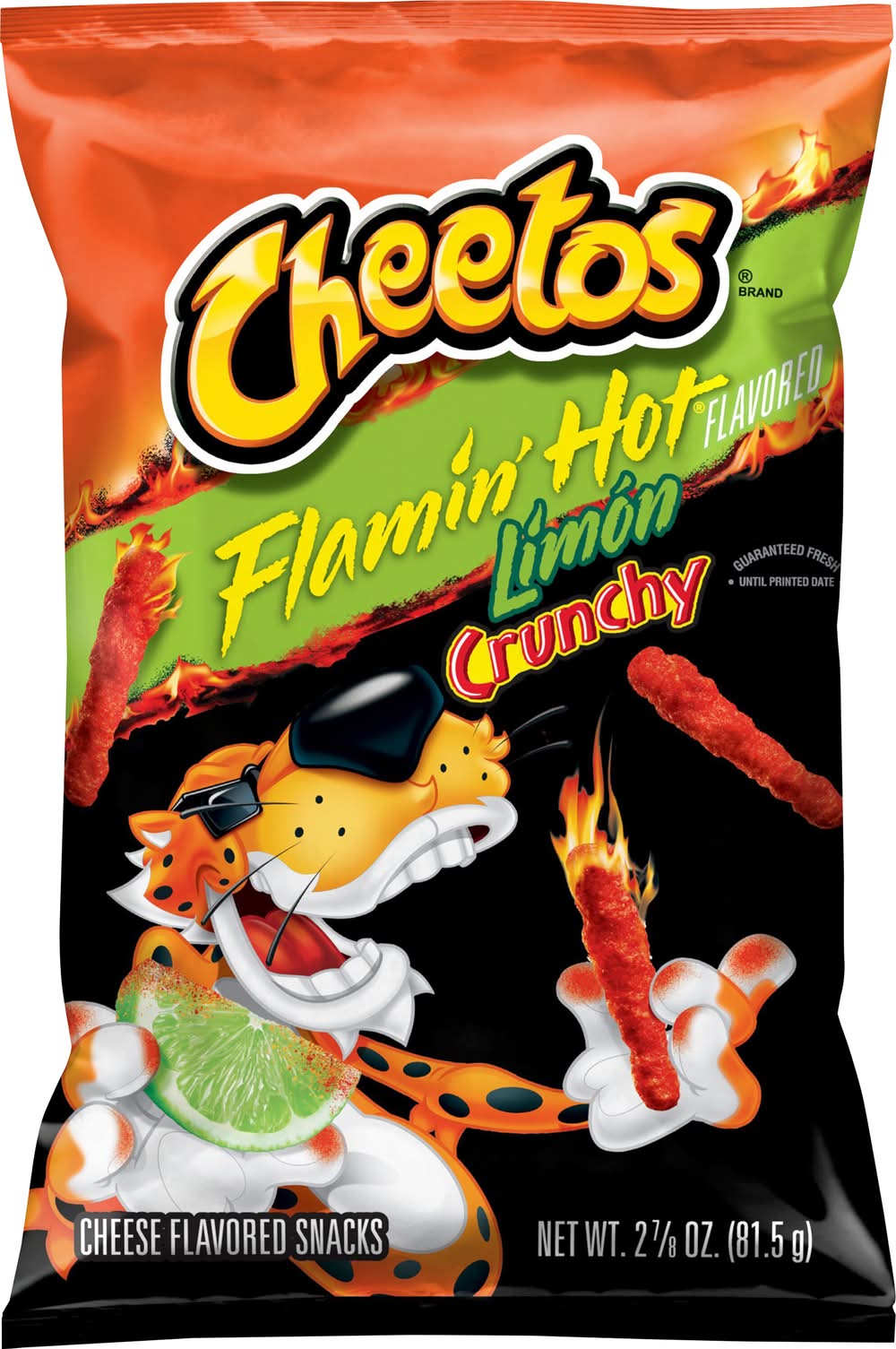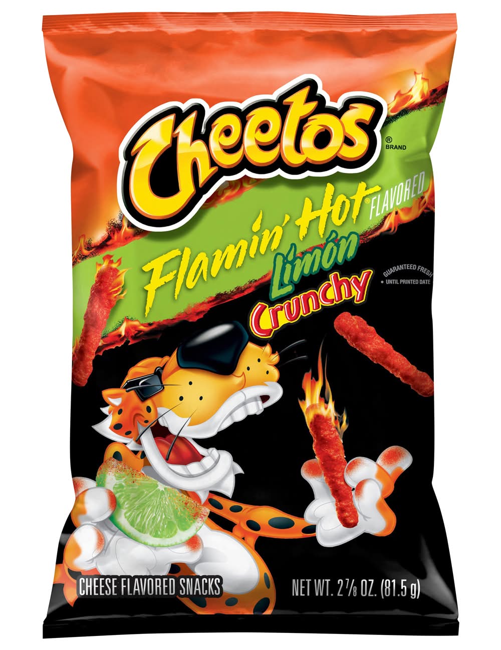 Cheetos snacks are the much-loved cheesy treats that are fun for everyone! You just can't eat a Cheetos snack without licking the signature off your fingertips. And wherever the brand and cheesy smiles are sure to follow. • Brand: Cheetos • Flavor: Flamin' hot limon • gluten-free