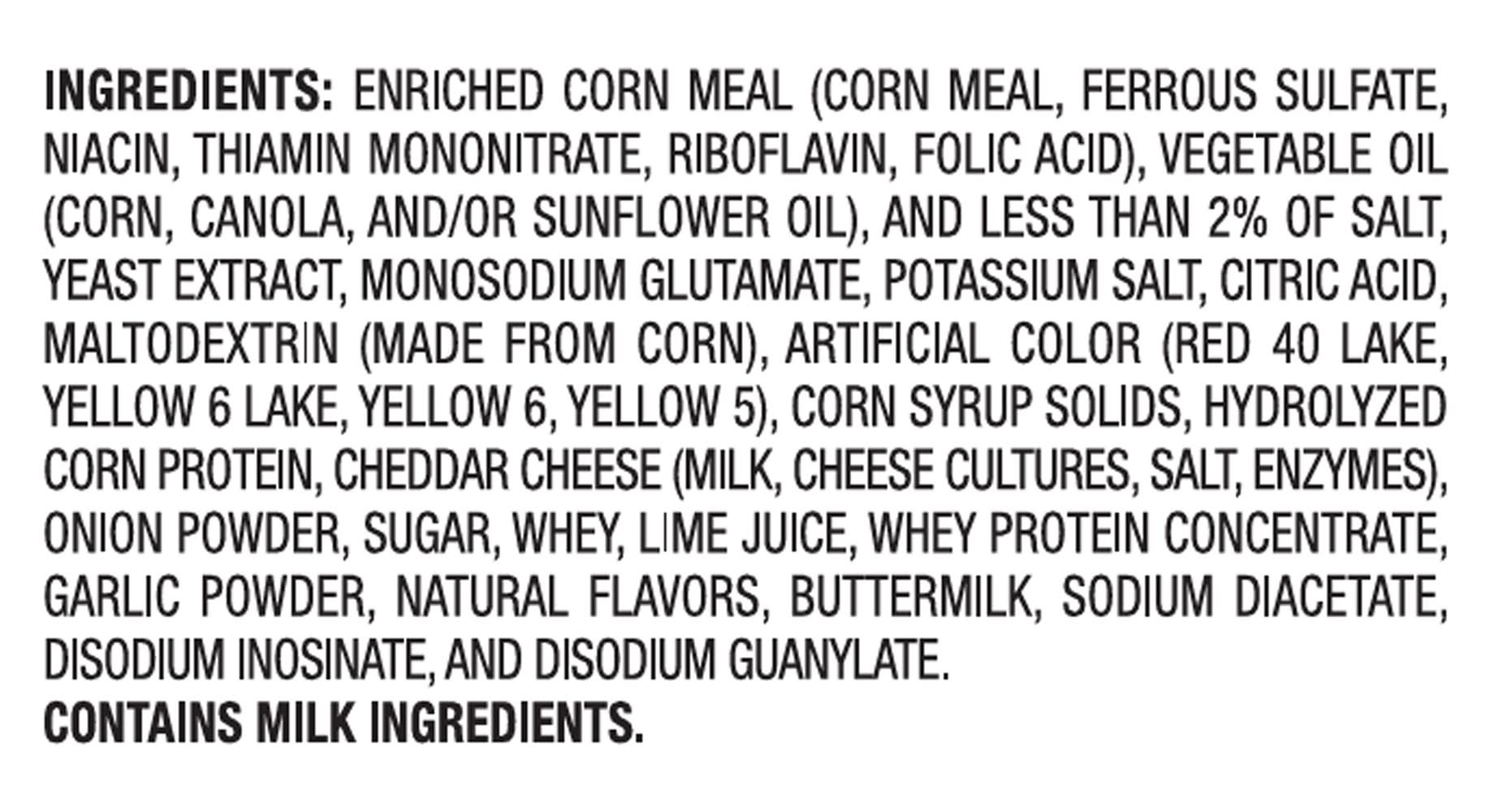 Ingredients: Enriched Corn Meal (Corn Meal, Ferrous Sulfate, Niacin, Thiamin Mononitrate, Riboflavin, Folic Acid), Vegetable Oil (Corn, Canola, and/or Sunflower Oil), and Less than 2% of Salt, Yeast Extract, Monosodium Glutamate, Potassium Salt, Citric Acid, Maltodextrin (Made from Corn), Artificial Color (Red 40 Lake, Yellow 6 Lake, Yellow 6, Yellow 5), Corn Syrup Solids, Hydrolyzed Corn Protein, Cheddar Cheese (Milk, Cheese Cultures, Salt, Enzymes), Onion Powder, Sugar, Whey, Lime Juice, Whey Protein Concentrate, Garlic Powder, Natural Flavors, Buttermilk, Sodium Diacetate, Disodium Inosinate, and Disodium Guanylate Contains: Milk