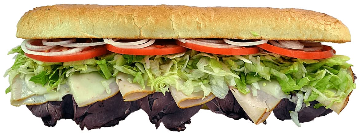 All natural USDA choice roast beef, roasted turkey breast, and melted provolone. Subs come on white bread with choice of lettuce, tomatoes, onions, Larrys Italian dressing, spicy mustard, and hellmanns mayonnaise with a pickle spear. Yellow mustard, non fat mayonnaise, low calorie Italian, bell peppers, pickles, black olives, cucumbers, carrots, oregano or oil, and vinegar.
