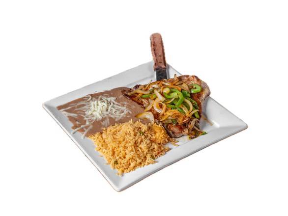 T-Bone *steak Grilled to order with rice, beans, onions, bell peppers and side salad. Notice: items may be cooked to order consuming raw or undercooked meats, poultry, seafood, shellfish or eggs may increase your risk or foodborne illness, especially if you have certain medical conditions.