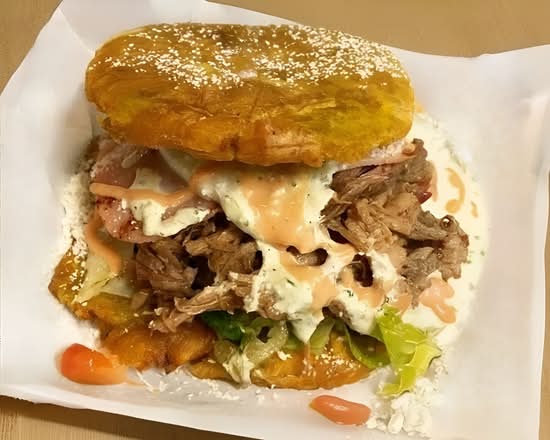 Mashed green carribean fried plantain sandwich. Made with venezuelan cheese (queso de mano) lettuce, tomato, ham, aged cheese, house salsa, and your choice of meat.