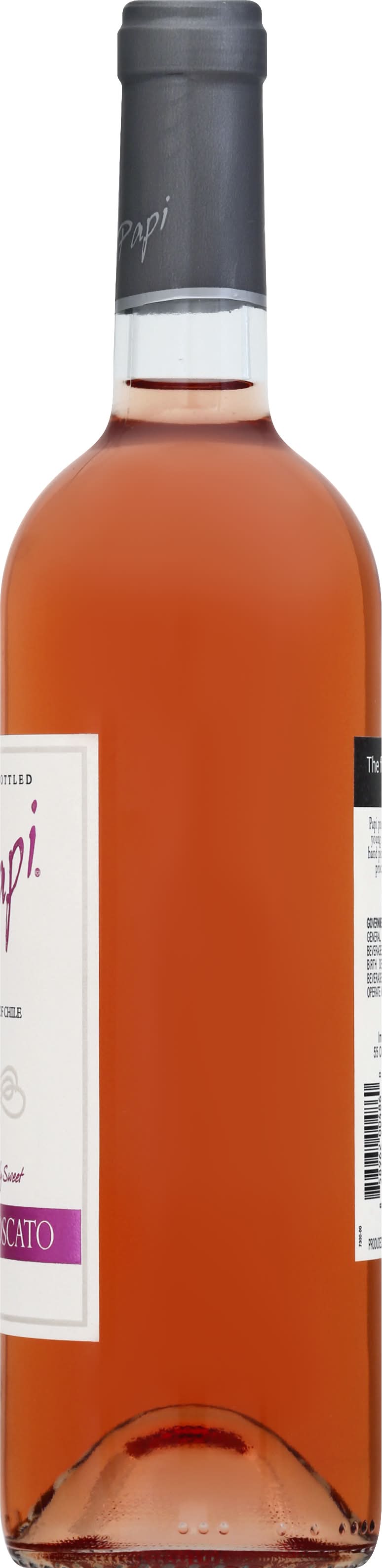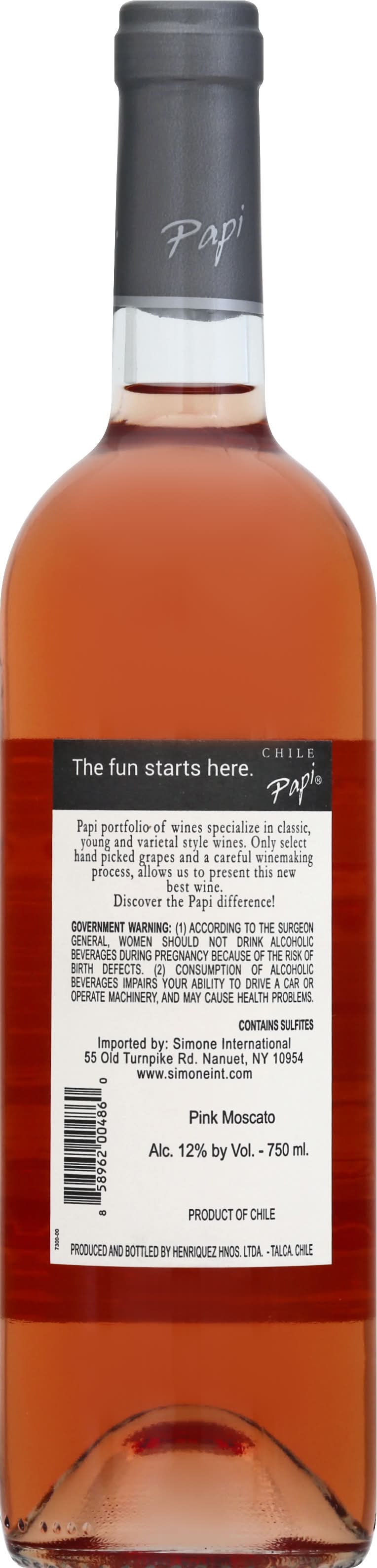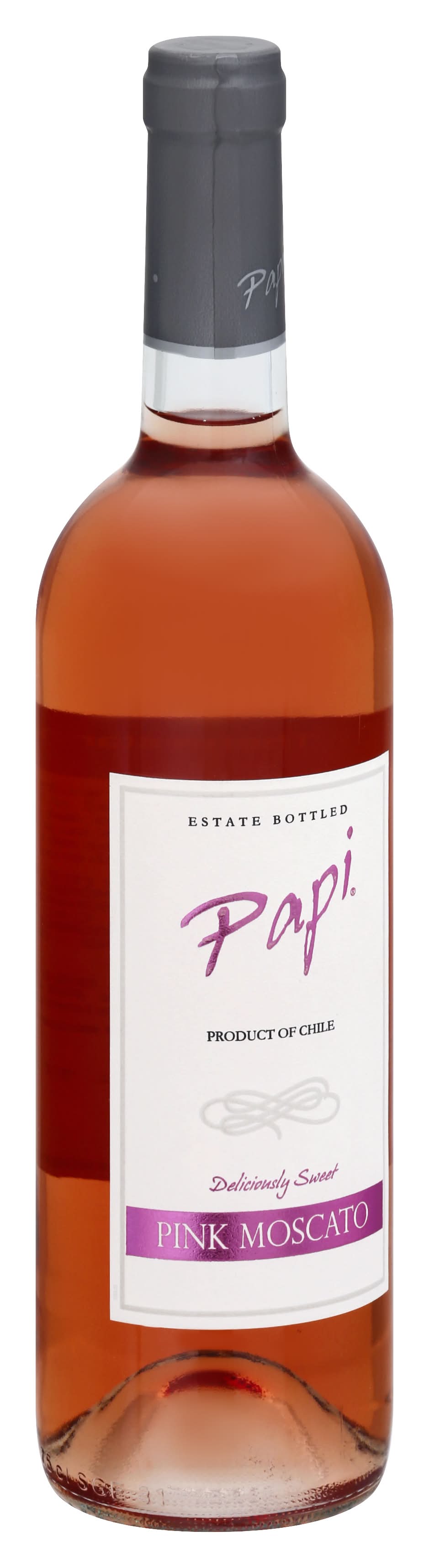 Beautiful light pink color. Explosive bouquet of jasmine and fresh fruits like pear and hints of oranges. Papi Pink Moscato's fresh acidity and sweet taste, pair perfectly with sweet and spicy snacks, as well as Mexican and Asian cuisines. • Brand: Papi • Category: Pink moscato • Alcohol by volume: 12% • Simone international, 55 Old Turnpike Rd., Nanuet, NY, 10954