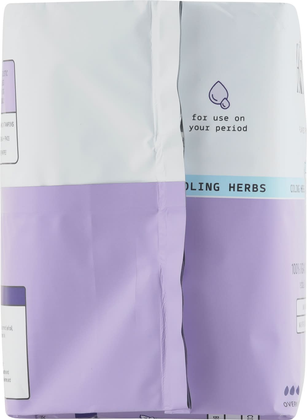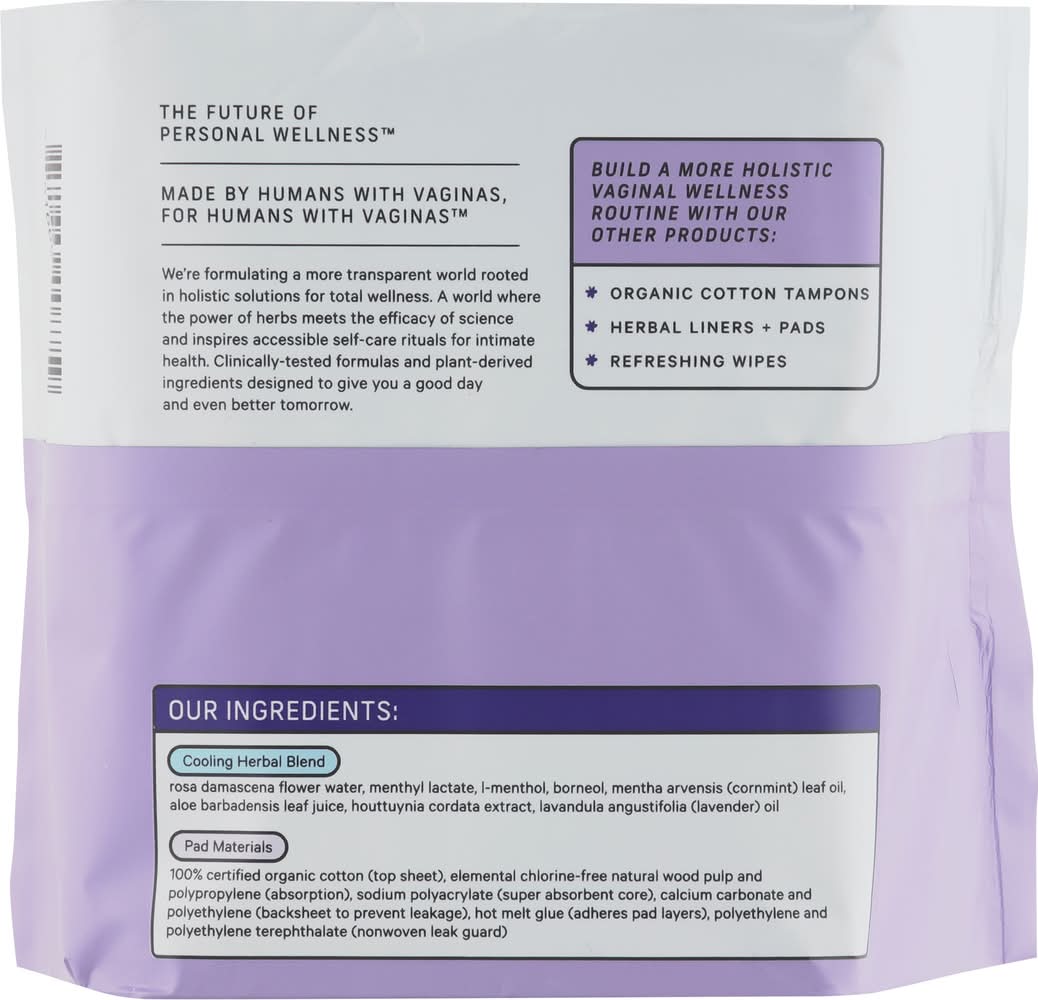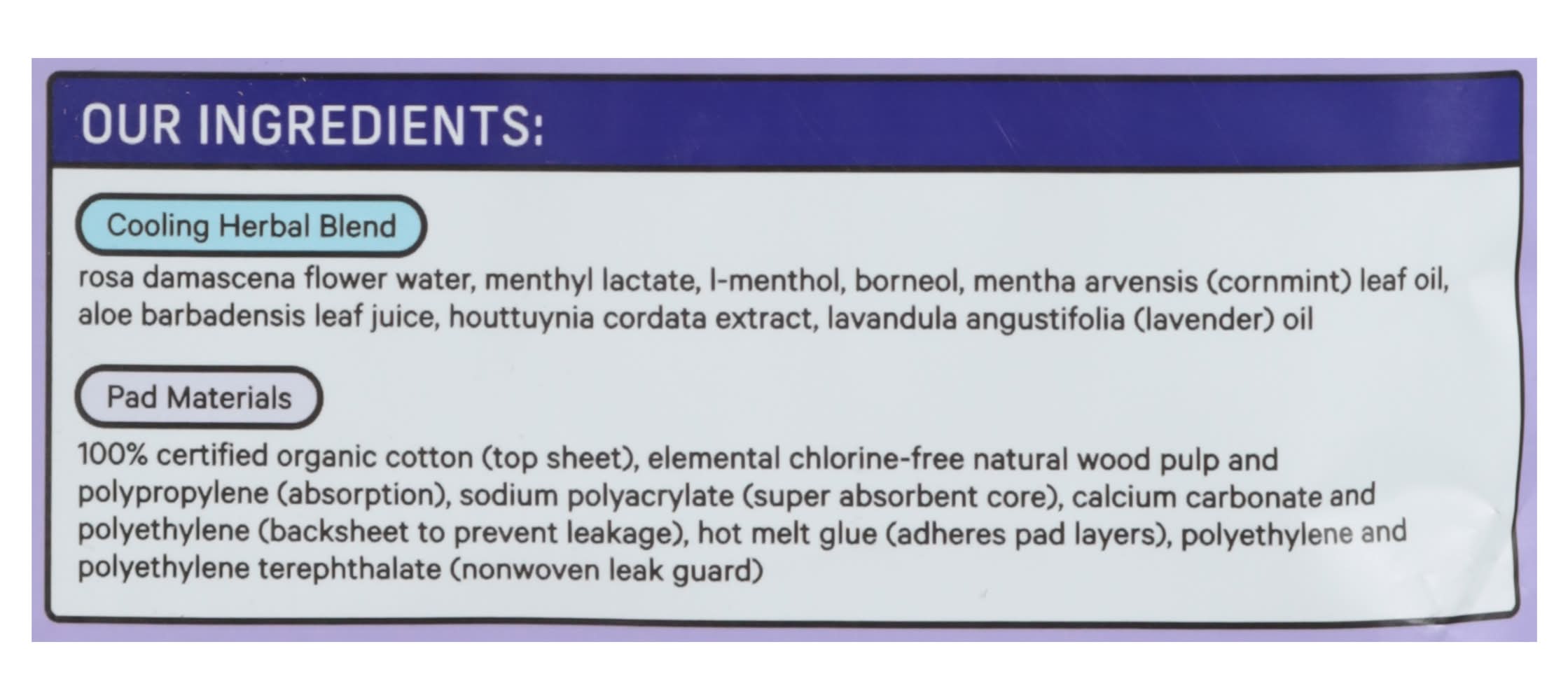 Ingredients: Our Ingredients: Cooling Herbal Blend: Rosa Damascena Flower Water, Menthyl Lactate, I-Menthol, Borneol, Mentha Arvensis (Cornmint) Leaf Oil, Aloe Barbadensis Leaf Juice, Houttuynia Cordata Extract, Lavandula Angustifolia (Lavender) Oil. Pad Materials: 100% Certified Organic Cotton (Top Sheet), Elemental Chlorine-Free Natural Wood Pulp and Polypropylene (Absorption), Sodium Polyacrylate (Super Absorbent Core), Calcium Carbonate and Polyethylene (Backsheet to Prevent Leakage), Hot Melt Glue (Adheres Pad Layers), Polyethylene and Polyethylene Terephthalate (Nonwoven Leak Guard)