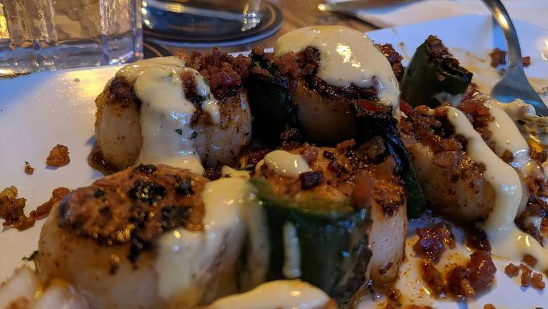 Spicy. 6 blackened sea scallops with jalapeño and served with homemade remoulade sauce and topped with bacon.