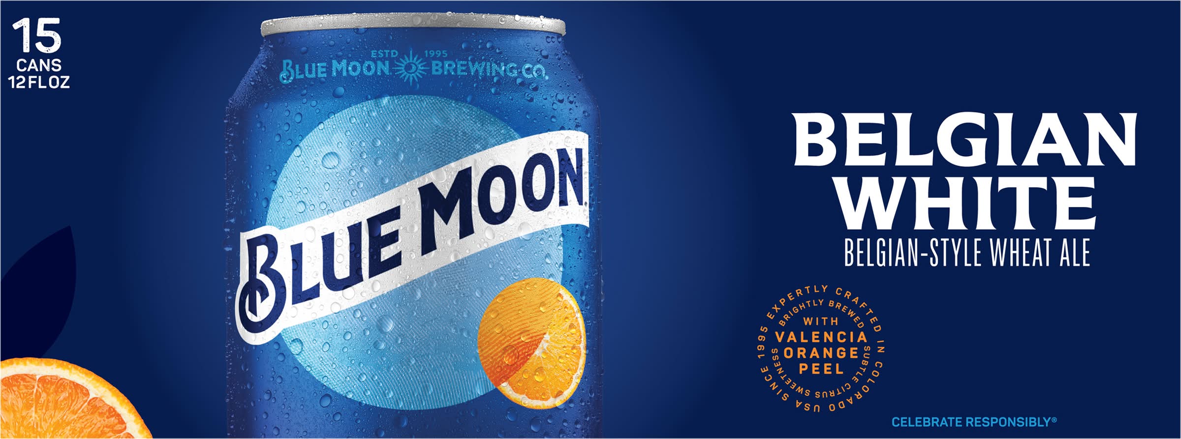 Crisp and tangy with subtle citrus sweetness, Blue Moon Belgian White is a Belgian-style wheat ale beer perfect for sharing. Full of zesty orange fruitiness, this citrus beer boasts a creamy body and light spicy wheat aroma. Pick up a Blue Moon beer anytime you or your friends need a refreshing drink. Crafted with Valencia orange peel, a touch of coriander, oats, and wheat, this light fruity beer provides a refreshing and balanced taste for every season. Blue Moon Belgian beer pairs well with many meals, including grilled seafood, salads, marinated chicken, and Asian dishes like pad thai. Grab a Blue Moon craft beer for watching the big game or sharing a meal with friends. Don't forget to garnish your Blue Moon beer bottles with an orange round to accentuate the beer's citrus aroma. Imagined in Belgium and crafted in Denver. • Pack size: 15 • Alcohol by volume: 5.4% • Packaging: Reusable