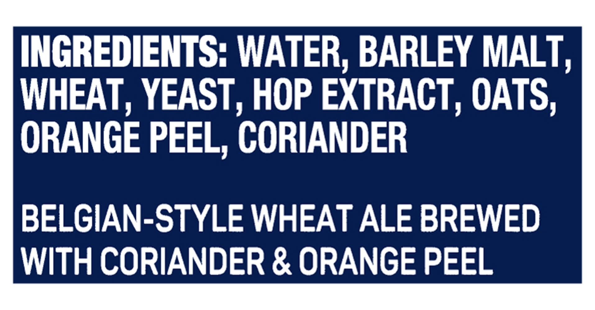 Ingredients: Water, Barley Malt, Wheat, Yeast, Hop Extract, Oats, Orange Peel, Coriander Contains: Barley, Wheat, Oat