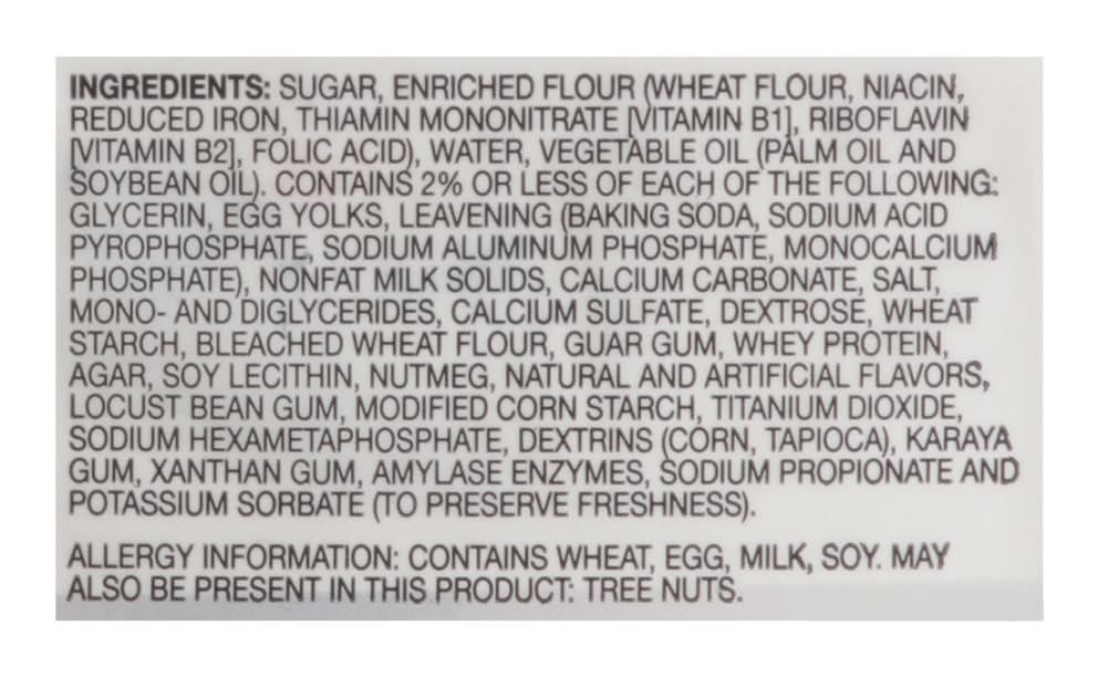 Ingredients: Sugar, Enriched Flour (Wheat Flour, Niacin, Reduced Iron, Thiamin Mononitrate, [Vitamin B1], Riboflavin [Vitamin B2], Folic Acid), Water, Vegetable Oil (Palm Oil and Soybean Oil), Contains 2% or Less of Each of the Following, Glycerin, Egg Yolks, Leavening (Baking Soda, Sodium Acid Pyrophosphate, Sodium Aluminum Phosphate, Monocalcium Phosphate), Nonfat Milk Solids, Calcium Carbonate, Salt, Mono- and Diglycerides, Calcium Sulfate, Dextrose, Wheat Starch, Bleached Wheat Flour, Guar Gum, Whey Protein, Agar, Soy Lecithin, Nutmeg, Natural and Artificial Flavors, Locust Bean Gum, Modified Corn Starch, Titanium Dioxide, Sodium Hexametaphosphate, Dextrins (Corn, Tapioca), Karaya Gum, Xanthan Gum, Amylase Enzymes, Sodium Propionate and Potassium Sorbate (to Preserve Freshness) Contains: Wheat, Eggs, Milk, Soybeans, Tree Nuts