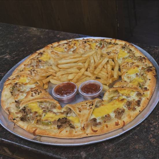 Philly Cheese Steak ,peppers, onions, mozzarella, American cheese wrapped in pizza dough, severed with French Fries