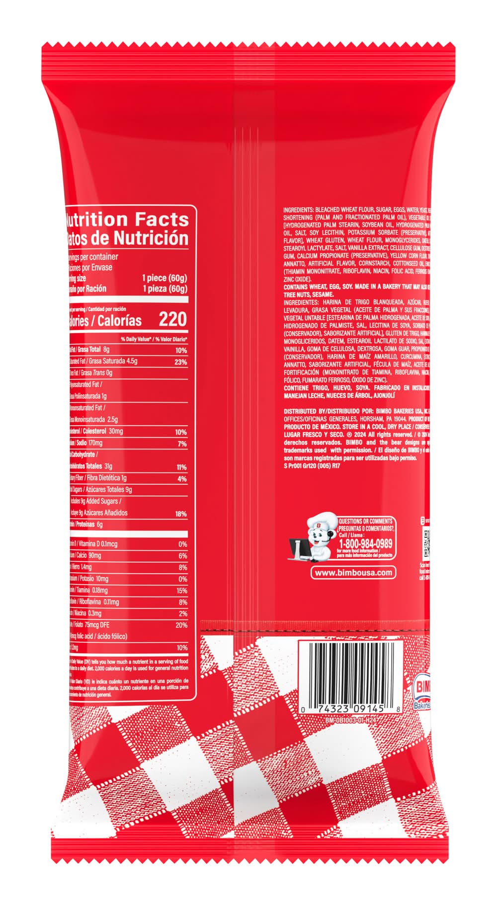 Bimbo Conchas are great for breakfast, merienda, and beyond. There are two parts to Conchas; the bread is slightly sweet, fluffy, topped with soft and crumbly vanilla sugar, and baked with love like all Bimbo breads and pastries. Wrapped for freshness, Conchas are great to pack in lunchboxes, to enjoy as an after-school snack, or to enjoy as a treat any time you need a sweet to brighten your day. They are perfect to eat as is or they can be warmed for a fresh-from-the-oven taste. Try slicing them open and adding a little jam and whipped cream for an easy dessert that can’t be beat. There is no wrong way or time to savor the flavor of one of Mexico’s most beloved pastry. Bimbo has been bringing families together for four generations. A family owned business since 1945, Bimbo Bakeries USA is the leading baking company in America, bringing families quality baked goods they can share with the ones they love. • Flavor: Vanilla • Number of servings: 2