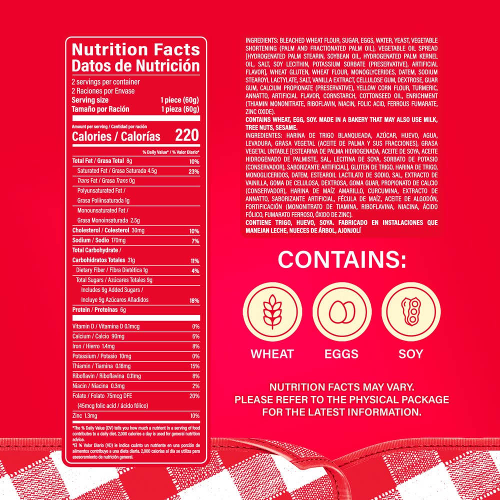 Ingredients: BLEACHED WHEAT FLOUR, SUGAR, EGGS, WATER, YEAST, VEGETABLE SHORTENING [PALM AND FRACTIONATED PALM OIL], VEGETABLE OIL SPREAD [HYDROGENATED PALM STEARIN, SOYBEAN OIL, HYDROGENATED PALM KERNEL OIL, SALT, SOY LECITHIN, POTASSIUM SORBATE (PRESERVATIVE), ARTIFICIAL FLAVOR], WHEAT GLUTEN, WHEAT FLOUR, MONOGLYCERIDES, DATEM, SODIUM STEAROYL LACTYLATE, SALT, VANILLA EXTRACT, CELLULOSE GUM, DEXTROSE, GUAR GUM, CALCIUM PROPIONATE (PRESERVATIVE), YELLOW CORN FLOUR, TURMERIC, ANNATTO, ARTIFICIAL FLAVOR, CORNSTARCH, COTTONSED OIL, ENRICHMENT [THIAMIN MONONITRATE, RIBOFLAVIN, NIACIN, FOLIC ACID, FERROUS FUMARATE, ZINC OXIDE], . Contains: CONTAINS EGG, SOY, WHEAT.