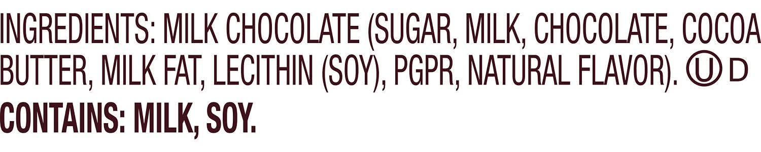 Ingredients: Milk Chocolate [Sugar Milk, Chocolate, Cocoa Butter, Milk Fat, Lecithin (Soy) PGPR, Natural Flavor] Contains: Contains: Soy|Milk