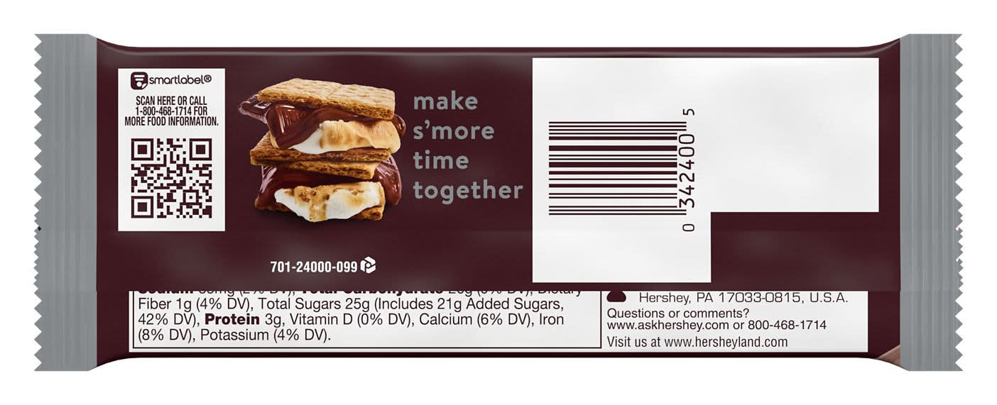 There's happy, and then there's HERSHEY'S happy. Made of the delectable, creamy milk chocolate that's been a classic for decades, HERSHEY'S milk chocolate candy bars make life more delicious, whether they're enjoyed alone or shared with loved ones while making s'mores over the campfire. This full size, kosher and gluten free candy is the perfect treat for countless special and everyday occasions. Keep a few full size candy bars on hand for guests and store some in your pantry for convenient snacking when the mood strikes. Whether camping, at a cookout, or on an ordinary night, make the perfect ooey, gooey s'more with classic HERSHEY'S milk chocolate as the star of the show. HERSHEY'S full size milk chocolate bars can be used to stuff Christmas stockings, fill Halloween trick or treat bags, top off Easter baskets and create Valentine's Day party favors for everyone you love. Show up to movie night with a bar of HERSHEY'S milk chocolate for everyone to please the whole crowd and perfect the night's snack selection. You can even sweeten up your favorite baked desserts with these chocolates by topping cupcakes, brownies, cookies and more with a section or two. Looking for a cool and refreshing chocolatey treat? Use sections of HERSHEY'S milk chocolate bars to top off your favorite flavor of ice cream and create a delicious chocolatey sundae to enjoy. Everyone is excited when they're reaching for HERSHEY'S milk chocolate, and now you can be too! The Hershey Company, Hershey,PA,17033-0815,U.S.A.