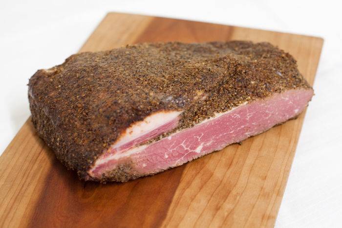 Homemade Pastrami is made from the beef brisket and cured for 2 weeks, then seasoned with black pepper and smoked for 5 hours.