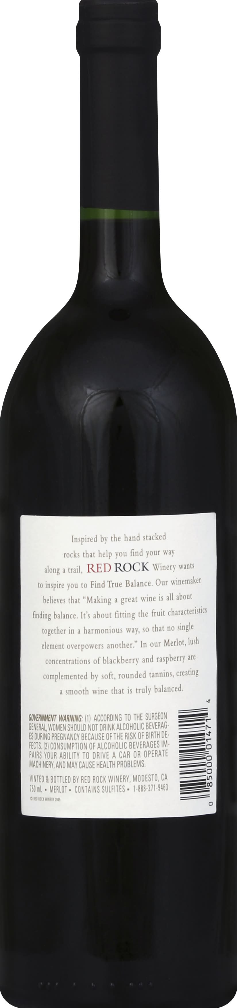 Inspired by the hand stacked rocks that help you find your way along a trail, Red Rock Winery wants to inspire you to find true balance. Our winemaker believes that making a great wine is all about finding balance. It's about fitting the fruit characteristics together in a harmonious way, so that no single element overpowers another. In our Merlot, lush concentrations of blackberry and raspberry are complemented by soft, rounded tannins, creating a smooth wine that is truly balanced. Alc. 13.6% by vol. • Brand: Red rock deli • Alcohol by volume: 13.6% • 2009