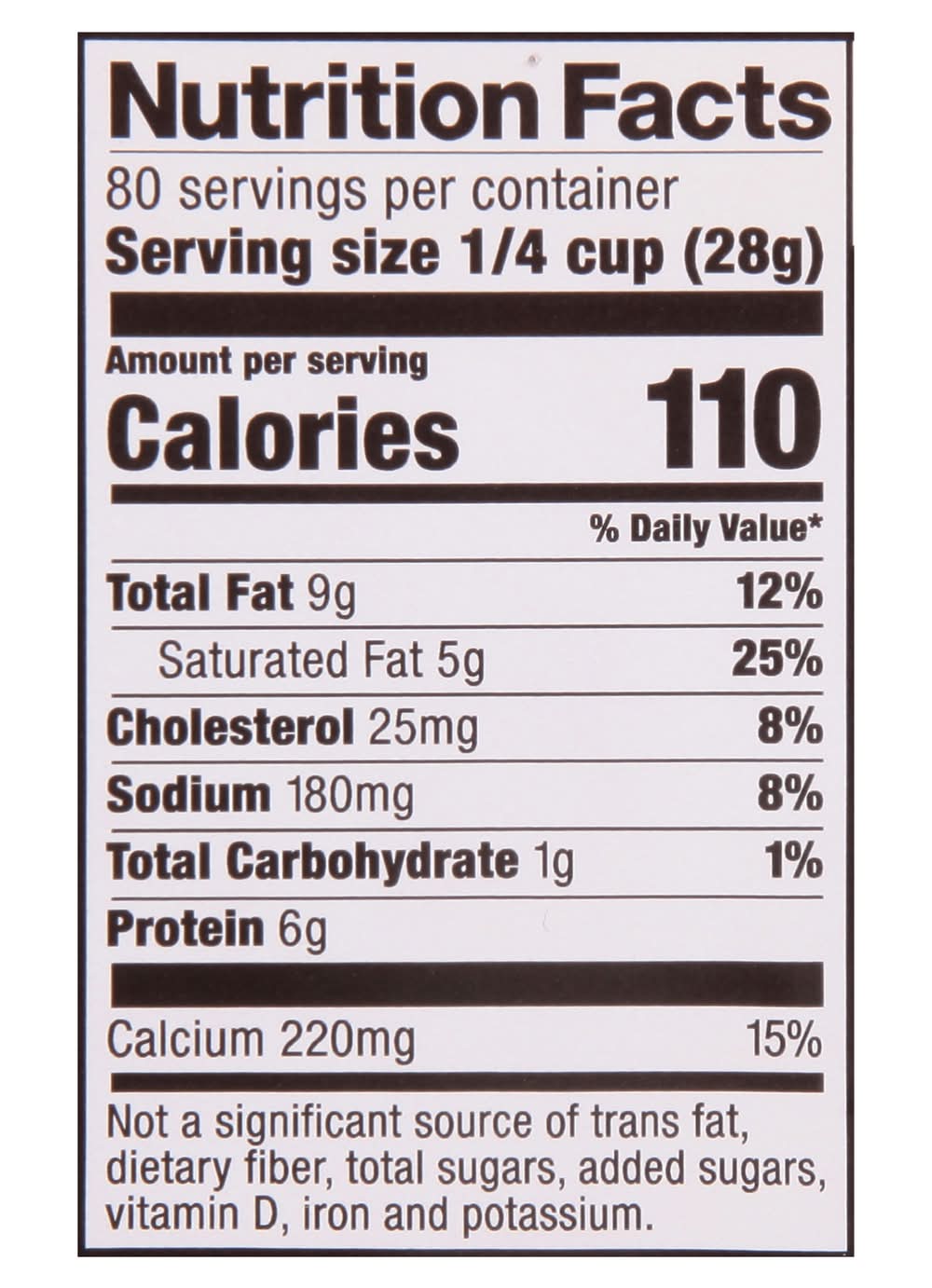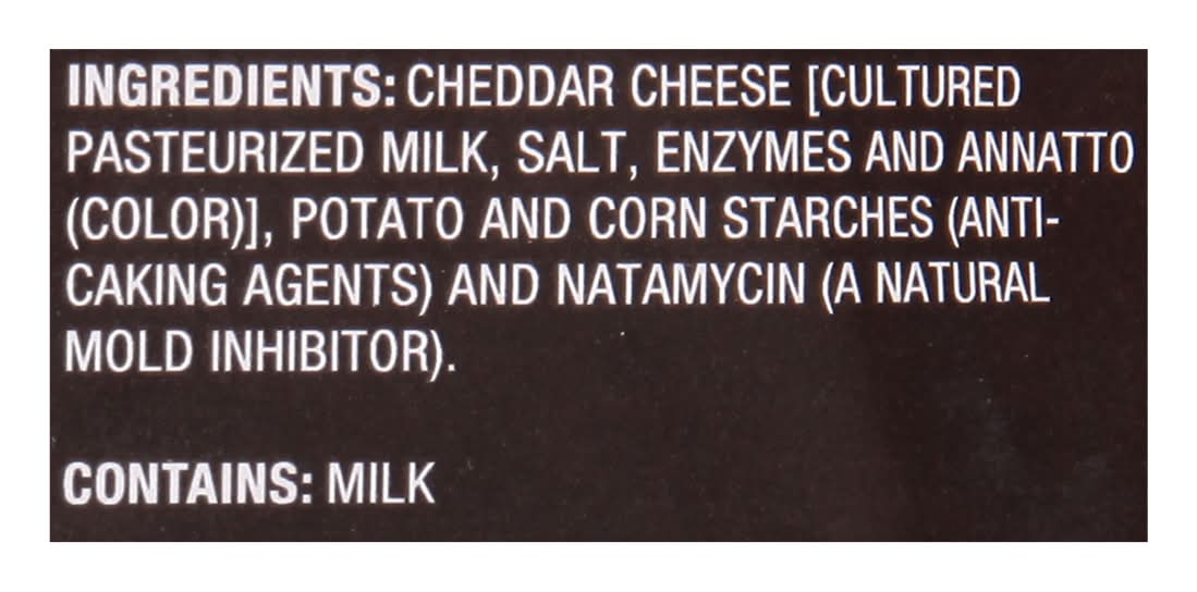 Ingredients: Cheddar Cheese (Cultured Pasteurized Milk, Salt, Enzymes and Annatto (Color)), Potato and Corn Starches (Anticaking Agents) and Natamycin (a Natural Mold Inhibitor) Contains: Milk, Corn