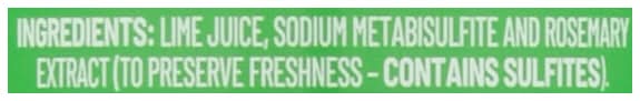 Ingredients: Lime Juice, Sodium Metabisulfite and Rosemary Extract (to Preserve Freshness - Contains Sulfites) Contains: Sulfites