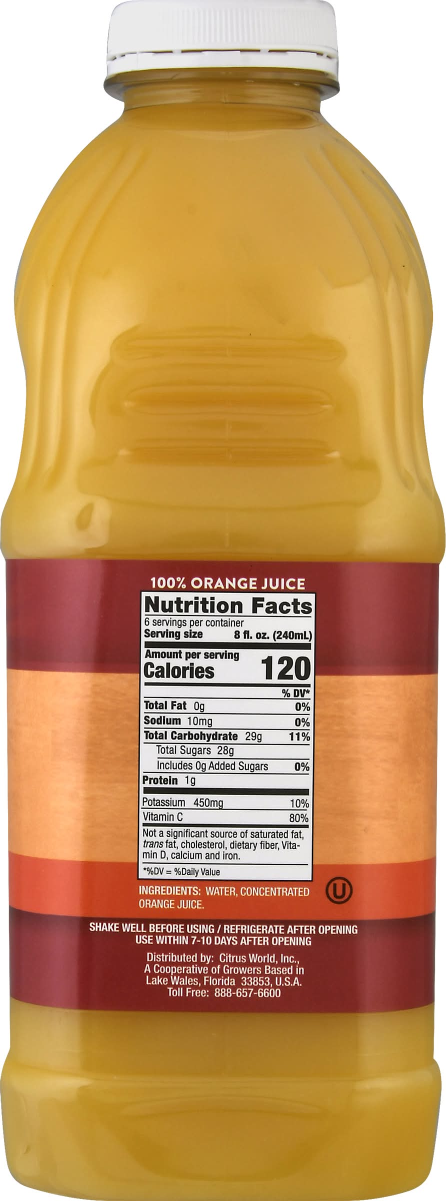100% Juice, Orange • Number of servings: 6 • Citrus World Inc., Lake Wales, FL, 33853, Ph: 888-657-6600