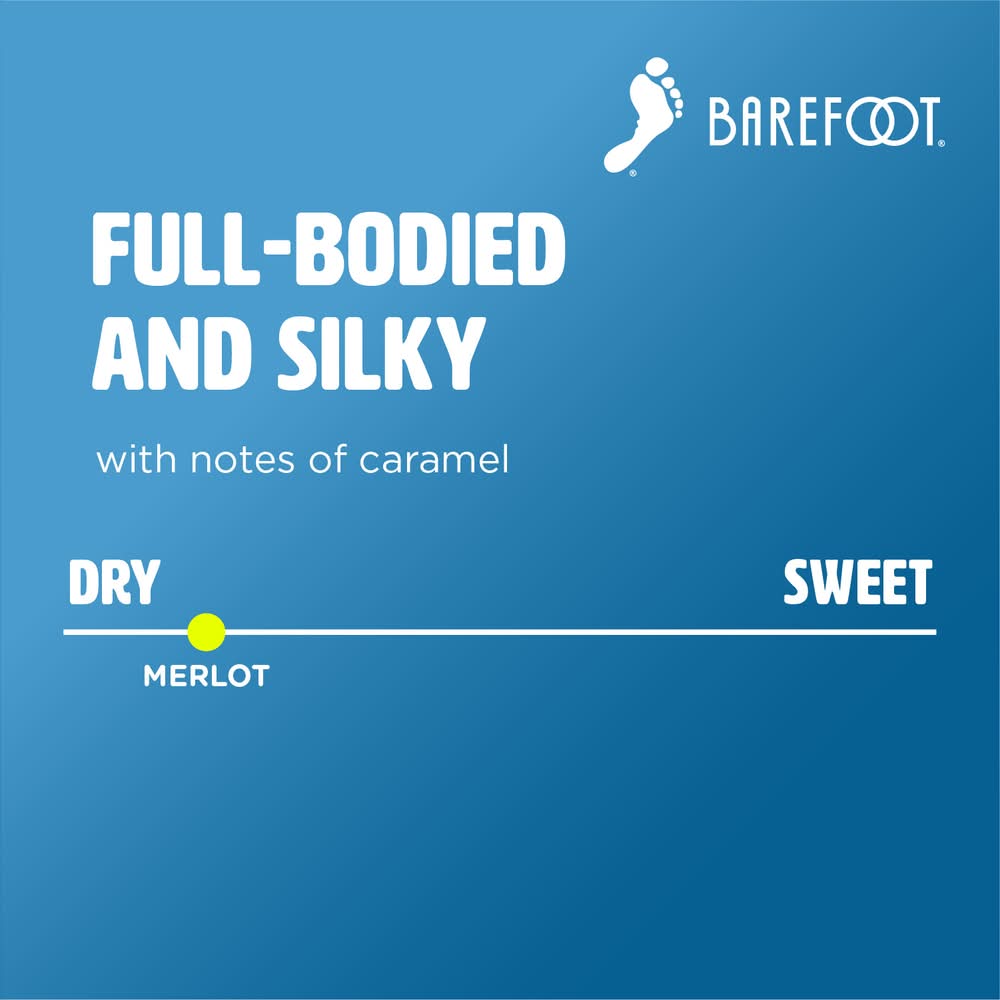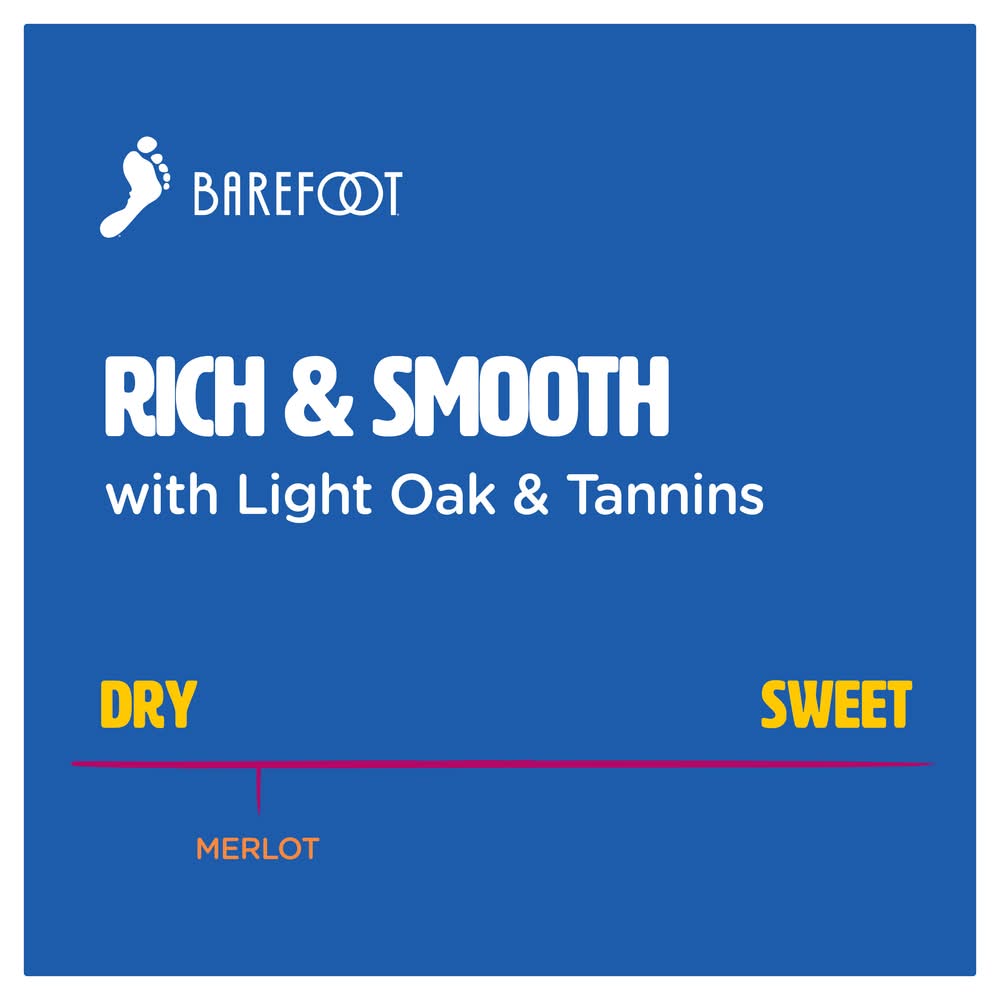 Gold Medal 2010 West Coast Wine Competition: Barefoot's Merlot blends have won consistent quality proven value. Barefoot Merlot is a luscious wine with alluring flavors of boysenberry and chocolate. Hints of anise and subtle tannins complement the decadent silky finish. Barefoot Merlot is perfect with beef, poultry, red sauce pastas, cheeses and desserts. Delightful! Get Barefoot and have a great time! Alc. 13% by vol. • Alcohol by volume: 13% • 2010