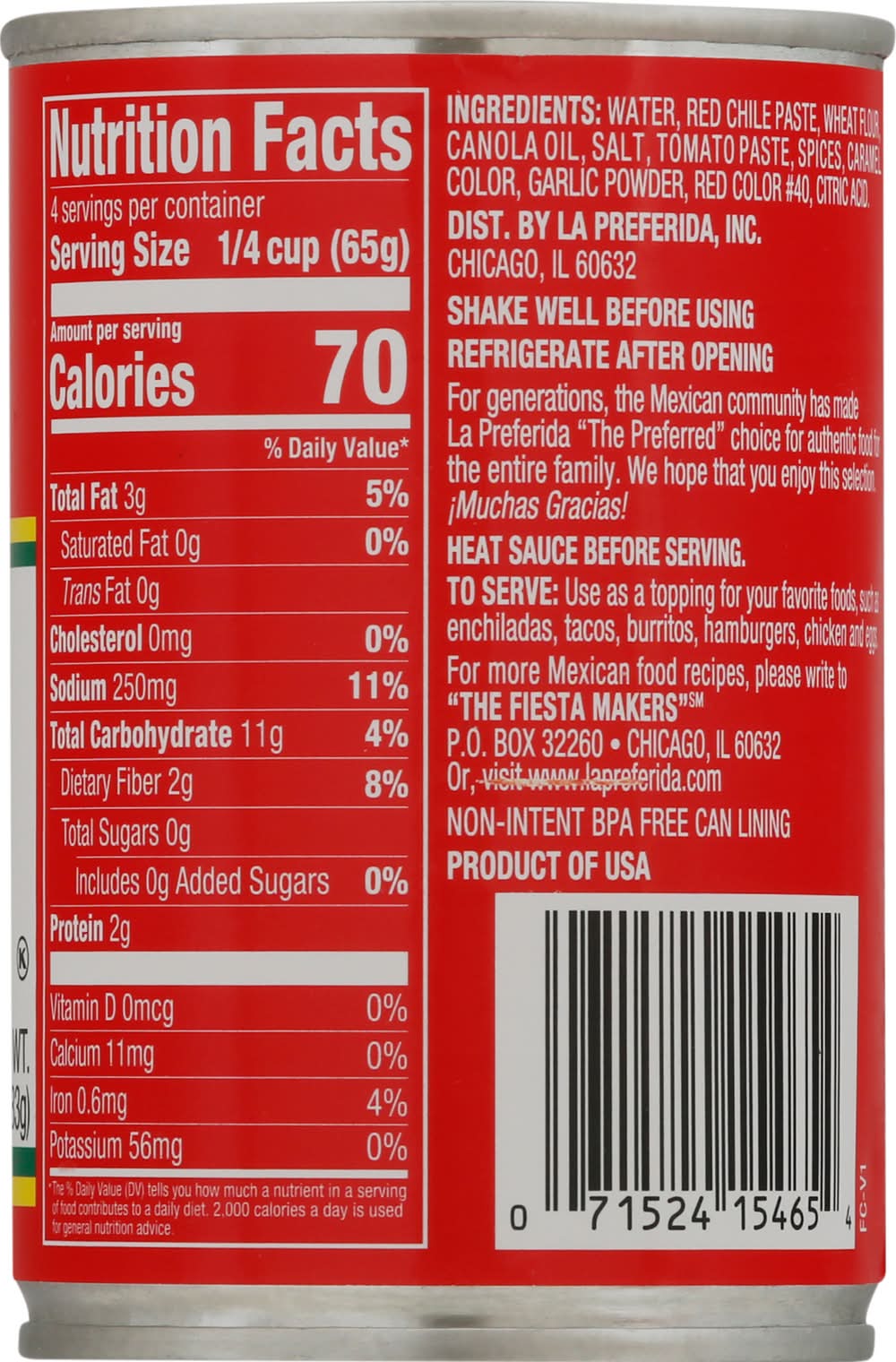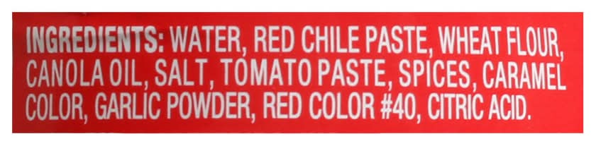 Ingredients: Water, Red Chile Paste, Wheat Flour, Canola Oil, Salt, Tomato Paste, Spices, Caramel Color, Garlic Powder, Red Color 40, Citric Acid Contains: Wheat