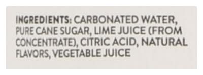 Ingredients: Carbonated Water, Pure Cane Sugar, Lime Juice (from Concentrate), Citric Acid, Natural Flavors, Vegetable Juice