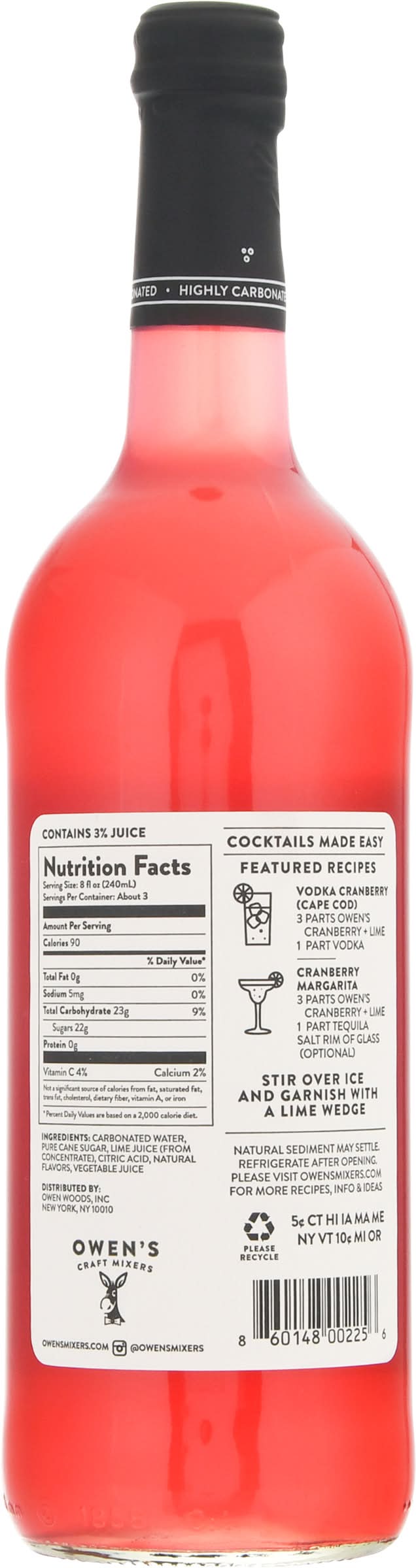 Directions for use: Pairs with vodka, gin, tequila & whiskey. Perfect for vodka cranberry cocktails! Cocktails made easy. Featured recipes. Vodka cranberry (Cape Cod) 3 parts Owen's Cranberry + Lime 1 part vodka. Cranberry Margarita 3 parts Owen's Cranberry + Lime 1 part tequila salt rim of glass (optional). Stir over ice and garnish with a lime wedge. Refrigerate after opening. Storage recommendation: Refrigerate after opening.