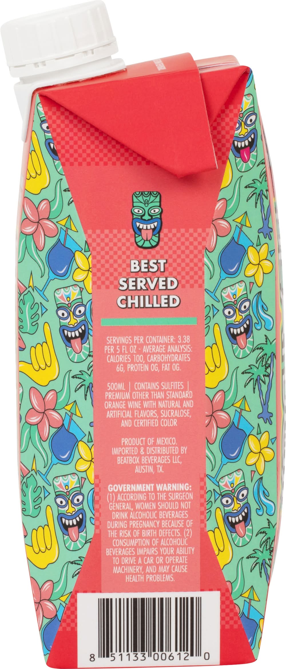 Must be 21+. Premium other than standard orange wine with artificial flavor, sucralose and certified color. World's tastiest party punch. Glass free. Premium other than standard orange wine with natural and artificial flavors, sucralose, and certified color. Certified B Corporation. Please recycle. 11.1% alcohol by volume. • Alcohol by volume: 11.1% • Packaging: Reusable
