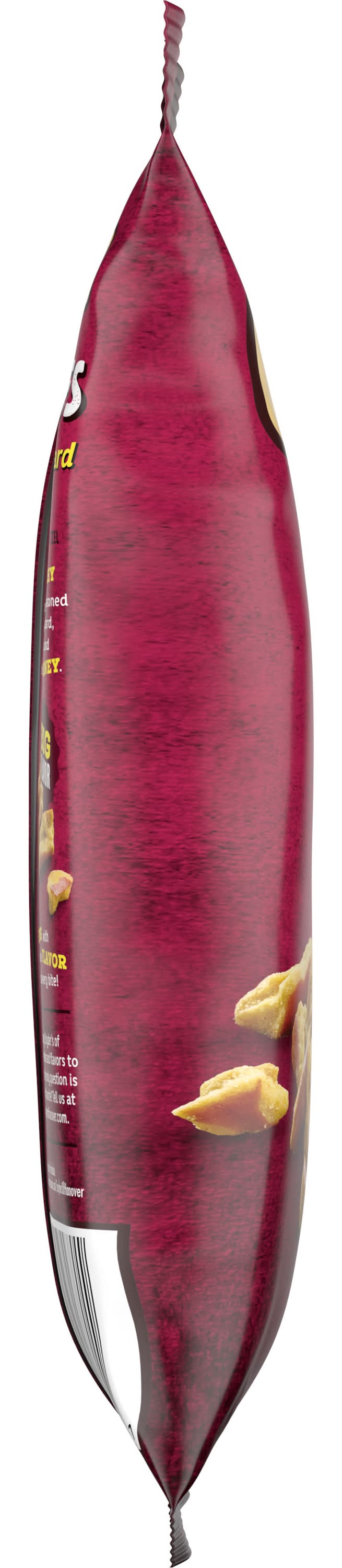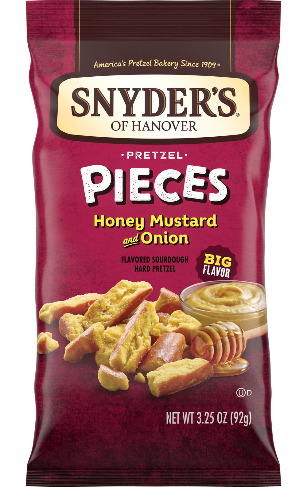 Snyder's of Hanover Honey Mustard and Onion Pretzel Pieces are bursting with craveable flavor in every bite! Enjoy crunchy sourdough pretzels, generously seasoned with tangy mustard, mild onion flavor, and the sweetness of honey. You'll love the crunch, hearty satisfaction, and bold flavor found in every bite. Our pretzel pieces are the perfect snack to crunch on during game day or as a lunchtime side. Snyder's of Hanover has been America's Pretzel Bakery since 1909, and our pretzels give you that delicious crunch for the perfect snack! Made in a facility that does not process peanuts, Snyder's pretzels are made from wholesome ingredients, kneaded, and oven baked to seal in all the flavor. Snyder's of Hanover pretzels have been shared across tables, across generations, and across the country, making us America's favorite pretzel brand. There’s nothing like the bold flavor of honey mustard and onion, and with a 3.25-oz. bag, it’s easy to feed your craving any time and anywhere. • Snyder's-Lance, Inc., Charlotte,NC,28277 • Packaging: Reusable
