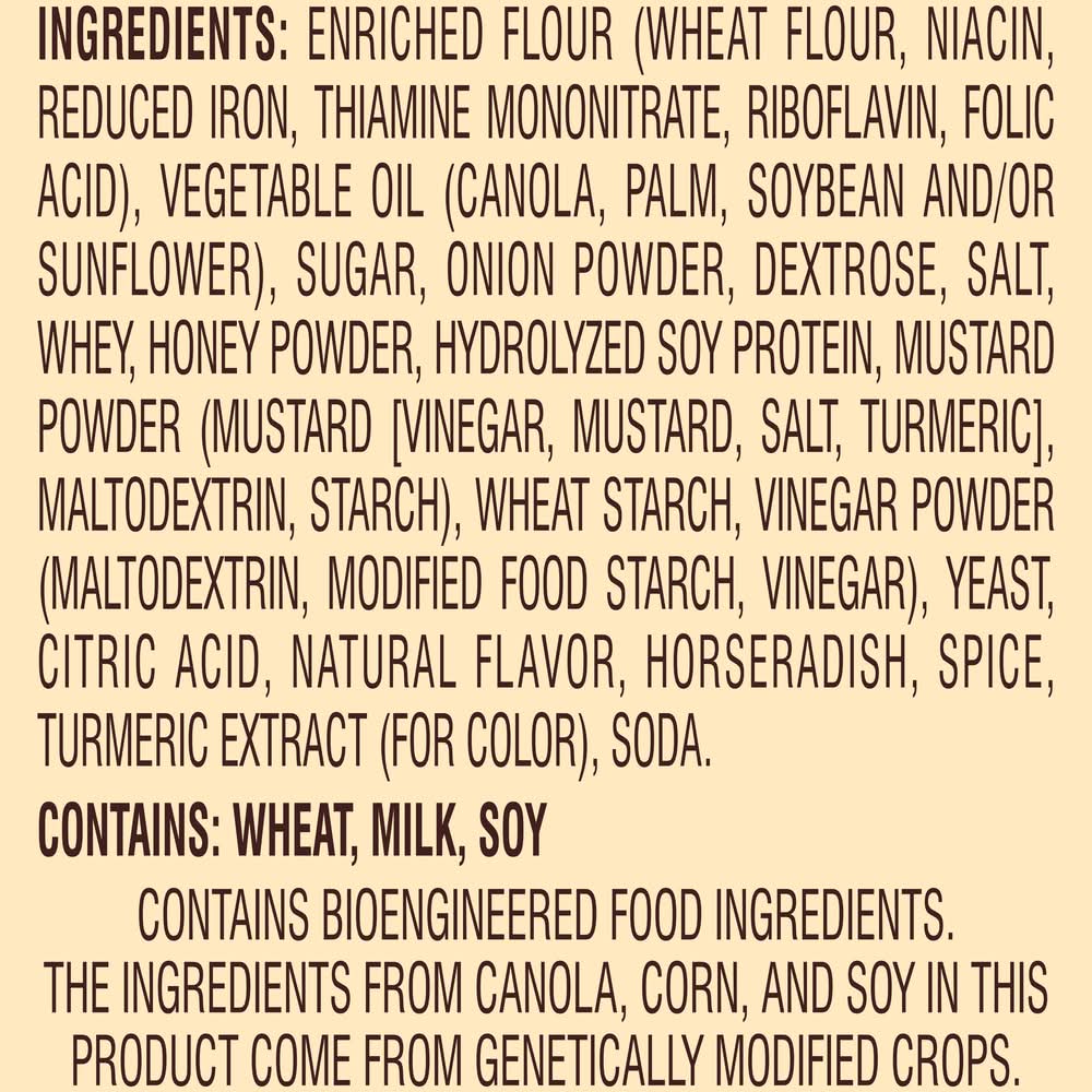 Ingredients: INGREDIENTS: ENRICHED FLOUR (WHEAT FLOUR, NIACIN, REDUCED IRON, THIAMINE MONONITRATE, RIBOFLAVIN, FOLIC ACID), VEGETABLE OIL (CANOLA, PALM, SOYBEAN AND/OR SUNFLOWER), SUGAR, ONION POWDER, DEXTROSE, SALT, WHEY, HONEY POWDER, HYDROLYZED SOY PROTEIN, MUSTARD POWDER (MUSTARD [VINEGAR, MUSTARD, SALT, TURMERIC], MALTODEXTRIN, STARCH), WHEAT STARCH, VINEGAR POWDER (MALTODEXTRIN, MODIFIED FOODSTARCH, VINEGAR), YEAST, CITRIC ACID, NATURAL FLAVOR, HORSERADISH, SPICE, TURMERIC EXTRACT (FOR COLOR), SODA. CONTAINS: WHEAT, MILK, SOY Contains: CONTAINS: Gluten, Milk/Dairy, Soybean, Wheat