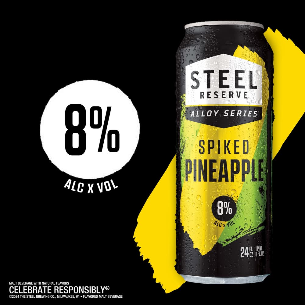 Enjoy an effervescent blast of pineapple flavor with a sweet and sour balance and slight bitter finish; try a Steel Reserve Alloy Series Spiked Pineapple Malt Beverage and experience a bold, refreshing, with a kick at 8.0% ABV. Great for hanging out with friends or relaxing at home, this flavored malt beverage is perfect for every occasion. The night is ripe for the taking, pick up a 4 pack of 16.0 fl oz cans and enjoy the refreshingly bold flavor of this high ABV malt beverage. And don't forget to try the other delicious Steel Reserve spiked flavors: watermelon, orange soda, strawberry, blk berry, cherry slushie, blue razz and island punch. • Flavor: Spiked pineapple • Pack size: 4 • Alcohol by volume: 8%