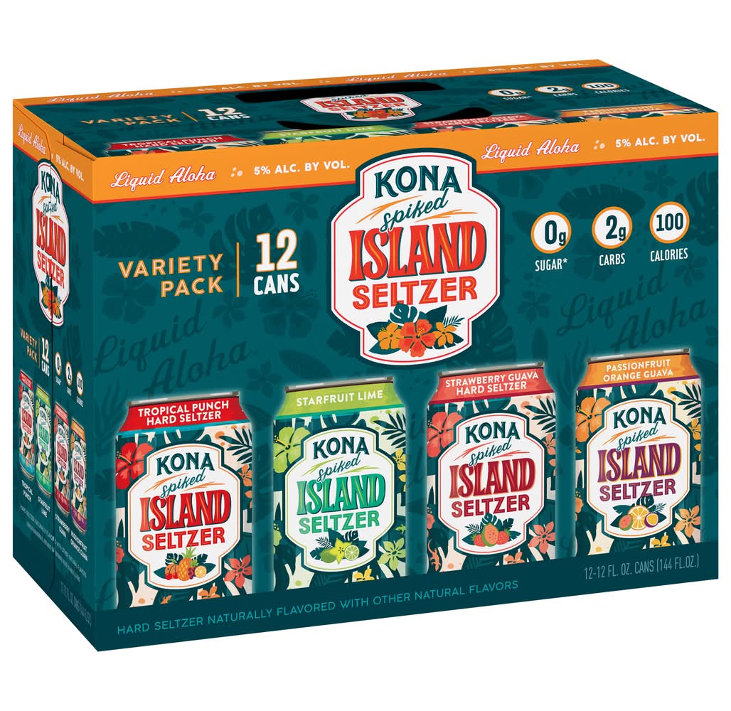 Kona Spiked Island Seltzer Variety Pack Hard Seltzer 12 Pack, 12 fl oz Cans, 5% ABV, Craft Beer. Liquid aloha. Transport Your Senses: Need a Hawaiian vacation? Every fizzy sip of our crisp hard seltzers is packed with tropical tastes that will transport your senses - no luggage needed! Sparkling bubbles, enticing aromas, and juicy flavors bring the islands right to you. What's even more refreshing? Kona Spiked Island Seltzers have zero sugar and are naturally gluten free. One life, right? Mahalo for recycling. Gluten Free. • Pack size: 12 • Alcohol by volume: 5% • Kona Brewing Co., Kona, HI, 96740 • Packaging: Reusable