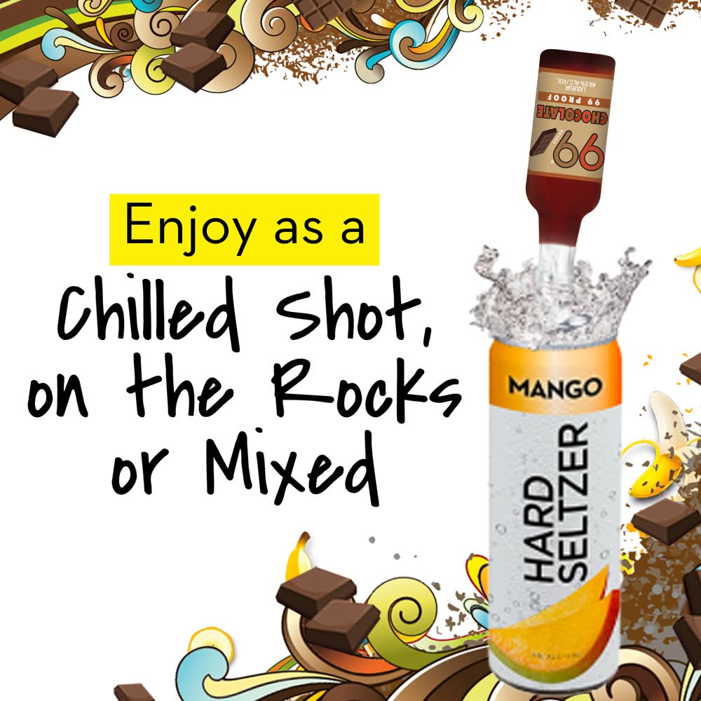 Liven up your experience with the excitingr. With 27 cordials and growing, 99 is America's #1 cordials brand. These liqueur shots are an amazing way to celebrate the good times and chill vibes. Each bottle of 99 Brand Chocolate liqueur has zero sugar and per 155 calories per 1.5 ounce shot. At 49.5% alcohol, 99 can be enjoyed straight out of the bottle as shots for a burst of tasty Perfect for any party or celebration with friends, tastes great in a multitude of spectacular alcoholic beverages, cocktails and mixed drinks. Add a splash to your hard seltzer for a full flavor explosion or combine a shot of this chocolate liqueur with other like to make a variety of delicious alcoholic beverages. Store 99 Chocolate at room temperature or pour it from your freezer for an icy shot. Live life in color with 99 Brand Liqueur. Please drink responsibly. • Flavor: Chocolate • Alcohol by volume: 49.5%