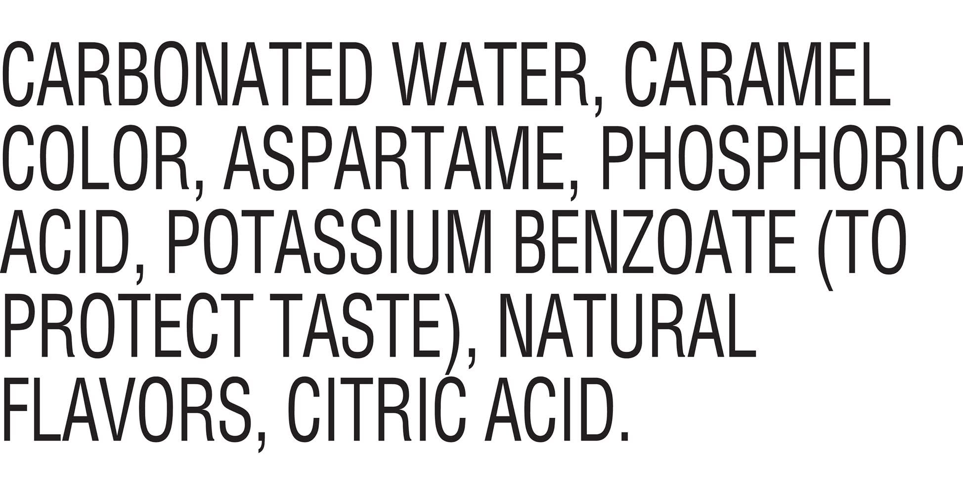 Ingredients: Carbonated Water, Caramel Color, Aspartame, Phosphoric Acid, Potassium Benzoate (To Protect Taste), Natural Flavors, Citric Acid. Contains: phenylalanine, Phenylketonurics