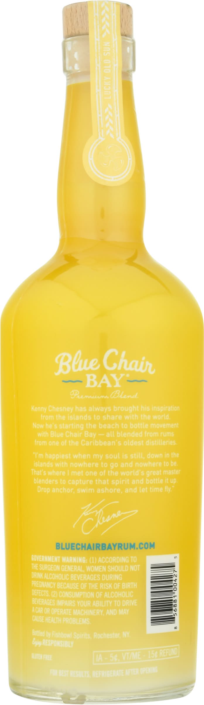 Lucky old sun. Premium Blend: There's a blue rocking chair sitting in the sand weathered by the storms and well oiled hands. It sways back and forth with the help of the winds and seems to always be there like an old trusted friend. Kenny Chesney has always brought his inspiration from the islands to share with the world. Now he's starting the beach to bottle movement with Blue Chair Bay - all blended from rums from one of the Caribbean's oldest distilleries. I'm happiest when my soul is still, down in the islands with nowhere to go and nowhere to be. That's where I met one of the world's great master blenders to capture that spirit and bottle it up. • Brand: Blue chair bay • Flavor: Banana • gluten-free • Alcohol by volume: 15%