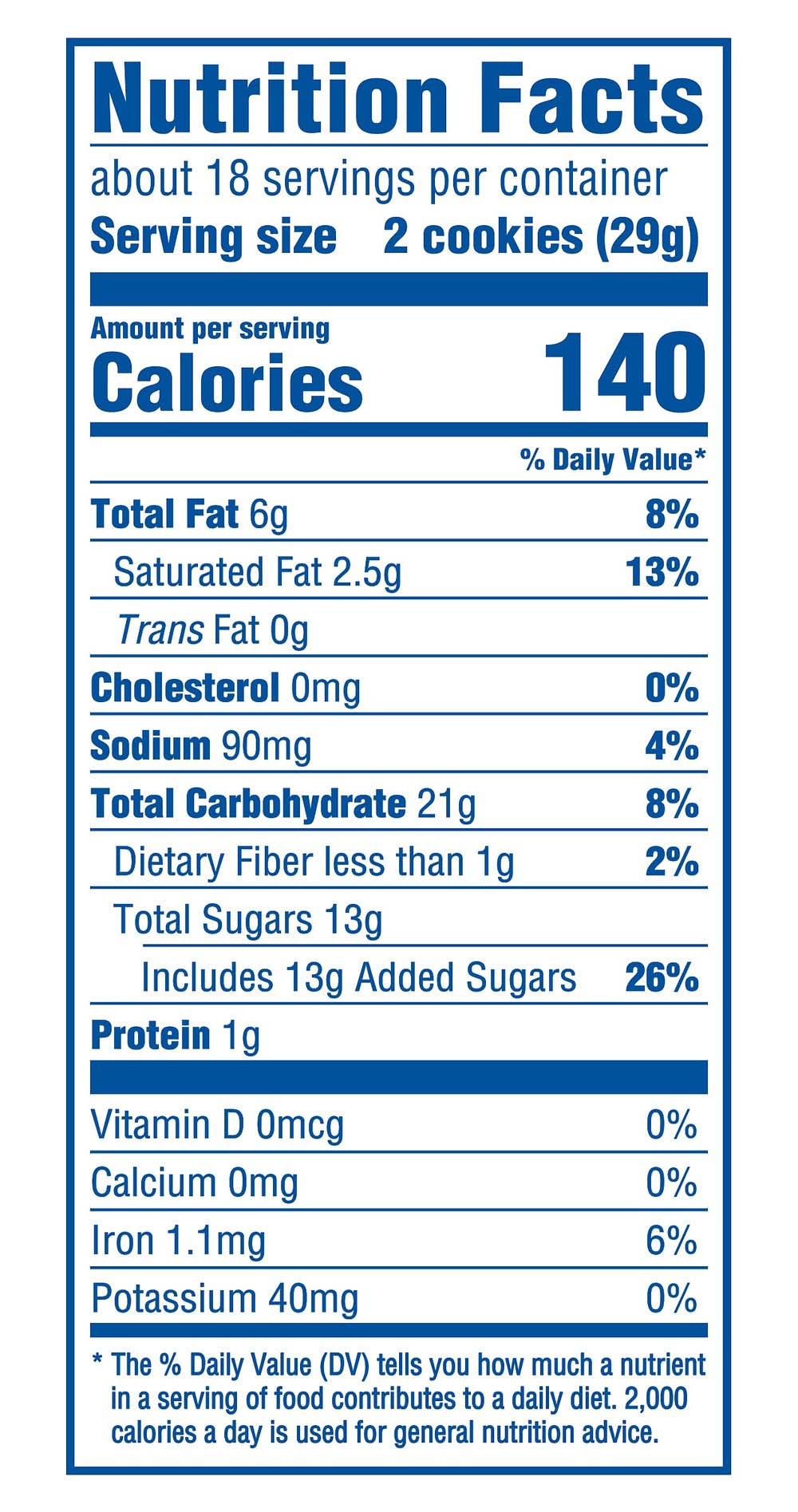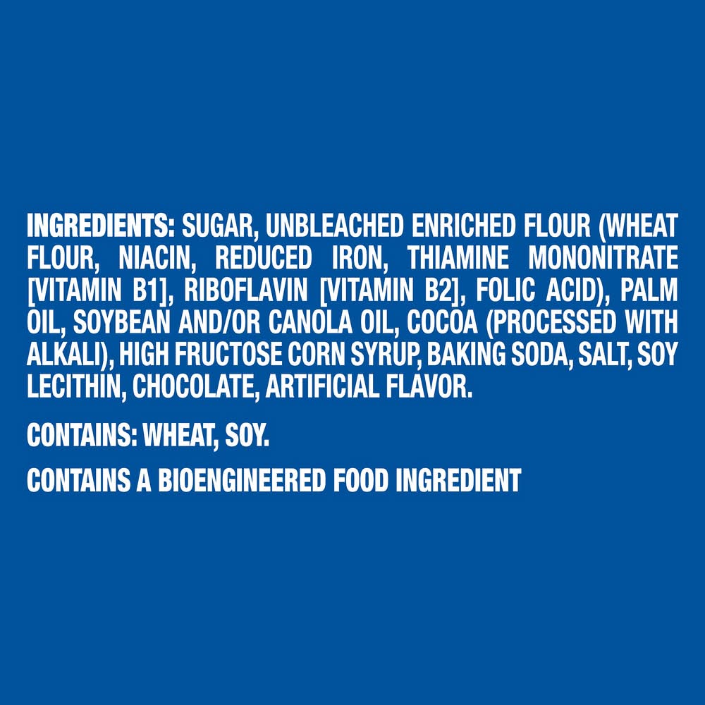 Ingredients: INGREDIENTS: SUGAR, UNBLEACHED ENRICHED FLOUR (WHEAT FLOUR, NIACIN, REDUCED IRON, THIAMINE MONONITRATE {VITAMIN B1}, RIBOFLAVIN {VITAMIN B2}, FOLIC ACID), PALM OIL, SOYBEAN AND, OR CANOLA OIL, COCOA (PROCESSED WITH ALKALI), HIGH FRUCTOSE CORN SYRUP, BAKING SODA, SALT, SOY LECITHIN, CHOCOLATE, ARTIFICIAL FLAVOR.CONTAINS: WHEAT, SOY. Contains: CONTAINS: WHEAT, SOY.
