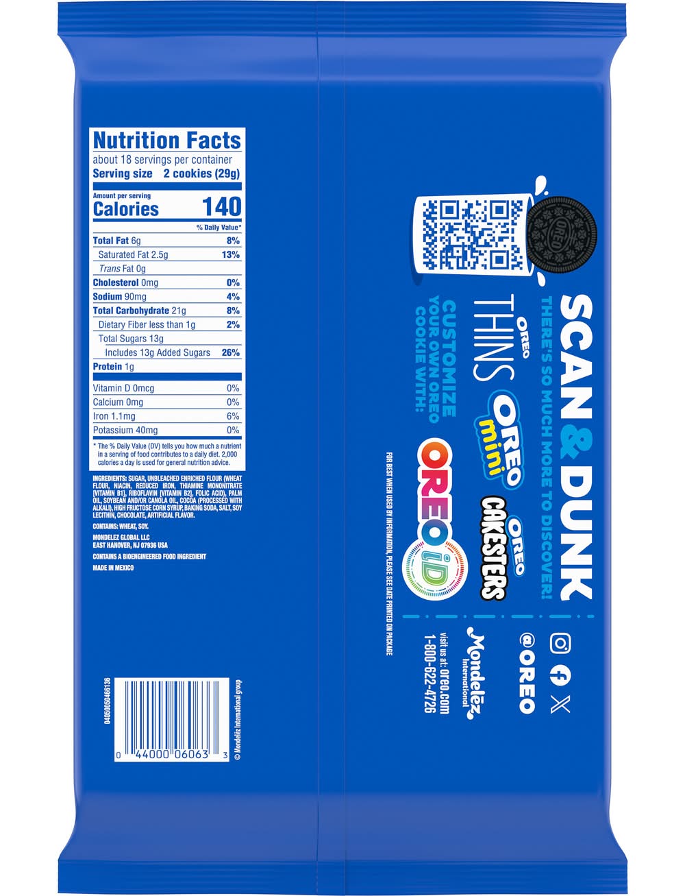 Take a delicious break with oreo chocolate creme chocolate sandwich cookies. Supremely dunkable, chocolate oreo cookies sandwich chocolate creme filling between two always made with real cocoa chocolate wafers making them milk's favorite cookie. Oreo chocolate sandwich cookies are great for serving as a dessert, with ice cream, as party snacks at your next gathering or for packing sweet snacks with lunch at school or work. You can even mix these bulk snack cookies into your favorite dessert recipe or cheesecake recipe for something a little extra special. The resealable package of oreo chocolate creme cookies with easy-pull tab keeps chocolate cookies fresh and is great for snacking, sharing or traveling. Grab a pack of oreo cookies so you're ready for any snacking occasion: even cookies for santa! • Brand: Oreo • Flavor: Chocolate
