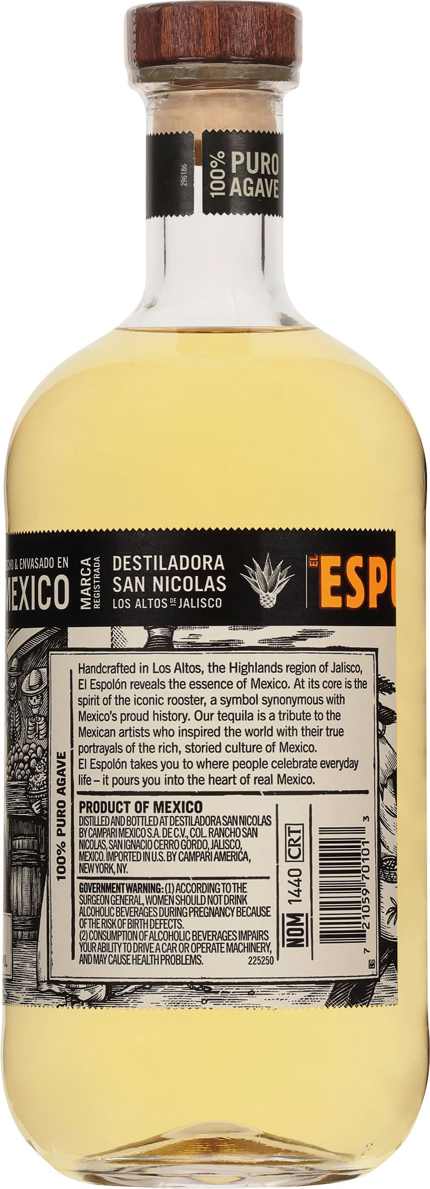 100% puro agave. Handcrafted in Los Altos, the Highlands region of Jalisco, El Espolon reveals the essence of Mexico. At its core is the spirit of the iconic rooster, a symbol synonymous with Mexico's proud history. Our tequila is a tribute to the Mexican artists who inspired the world with their true portrayals of the rich, storied culture of Mexico. El Espolon takes you to where people celebrate everyday life-it pours you into the heart of real Mexico. 40% alc. /vol. 80 Product of Mexico. Distilled and bottled at Destiladora San Nicolas by Campari Mexico S.A. DE C.V., Col. Rancho San Nicolas, San Ignacio Cerro Gordo, Jalisco, Mexico. Alcohol by volume: 40%