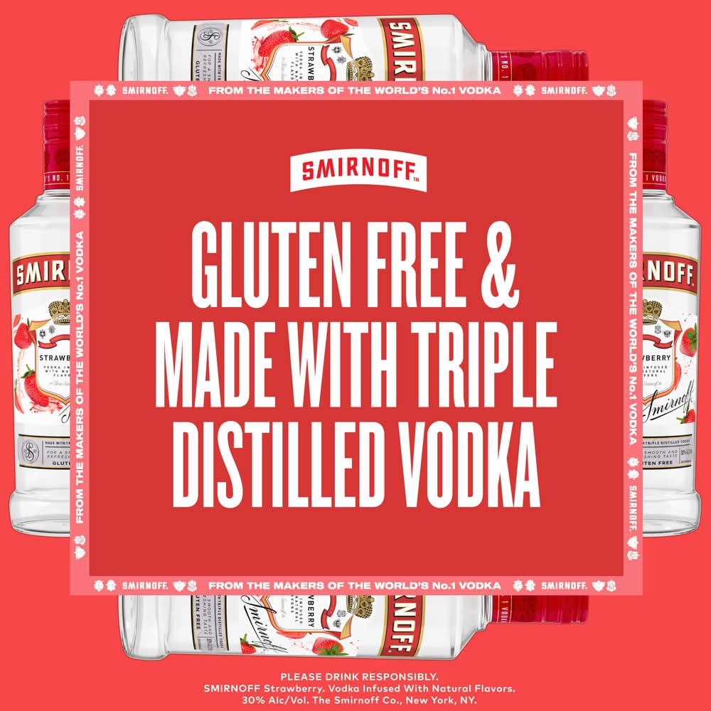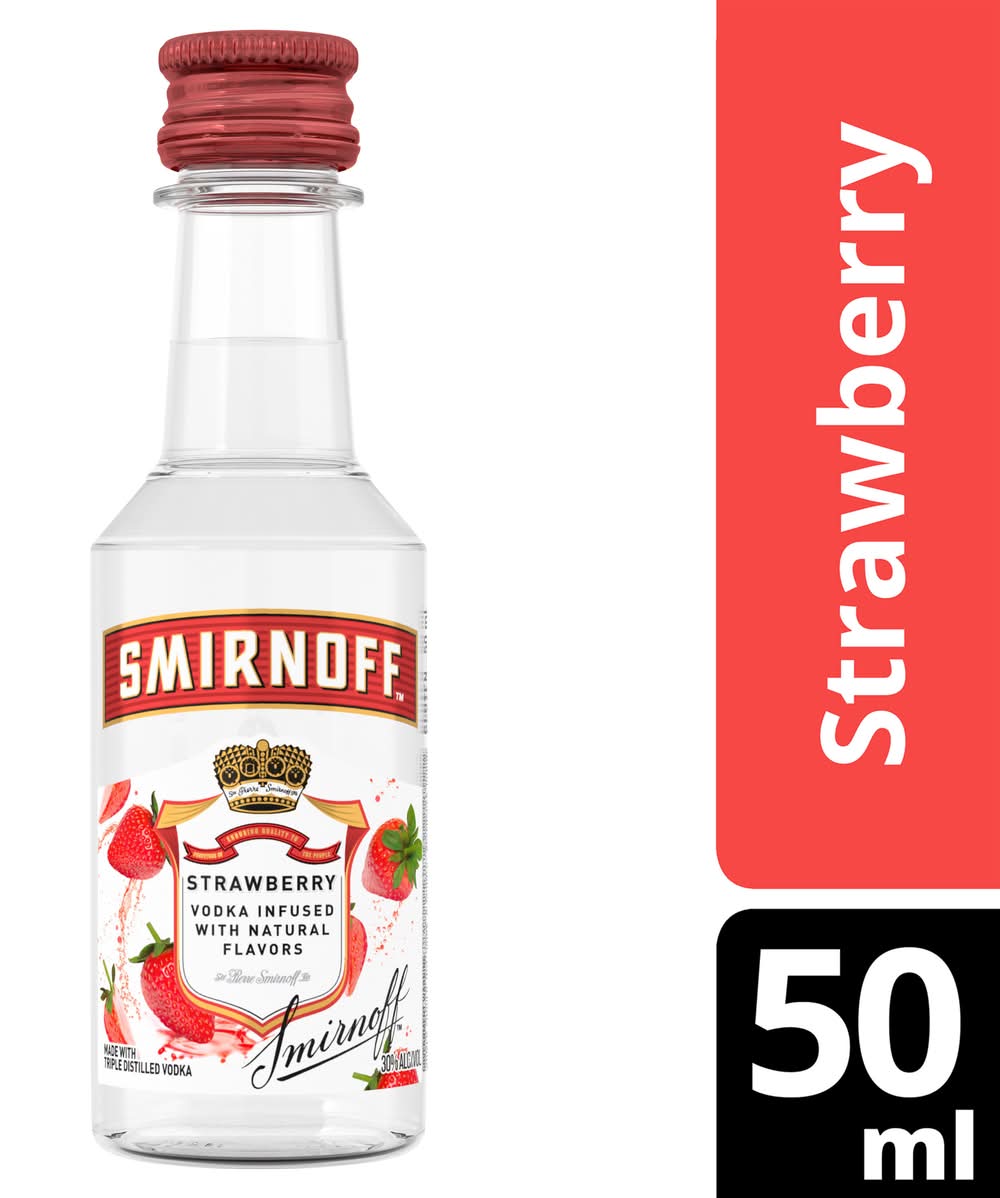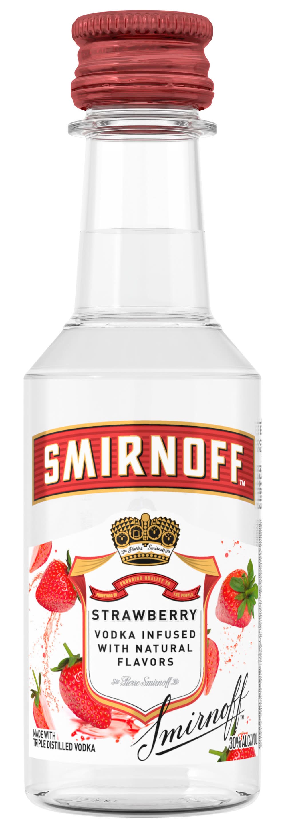 Infused with natural strawberry for a juicy berry finish, Smirnoff Strawberry is the perfect vodka for your next cocktail party. Triple distilled, this 60 proof vodka is smooth enough to drink on the rocks or in a round of vodka shots. Simply mix this gluten free vodka with soda, lemonade or cranberry juice for a delicately sweet, refreshing tasting mixed drink that's quick and easy to make. Smirnoff Strawberry’s tasty fruit infused flavors allow for endless unique drink ideas. Includes one 60 proof 50 mL bottle of Smirnoff Strawberry. Please enjoy responsibly. • Flavor: Strawberry • Alcohol by volume: 30% • Packaging: Reusable