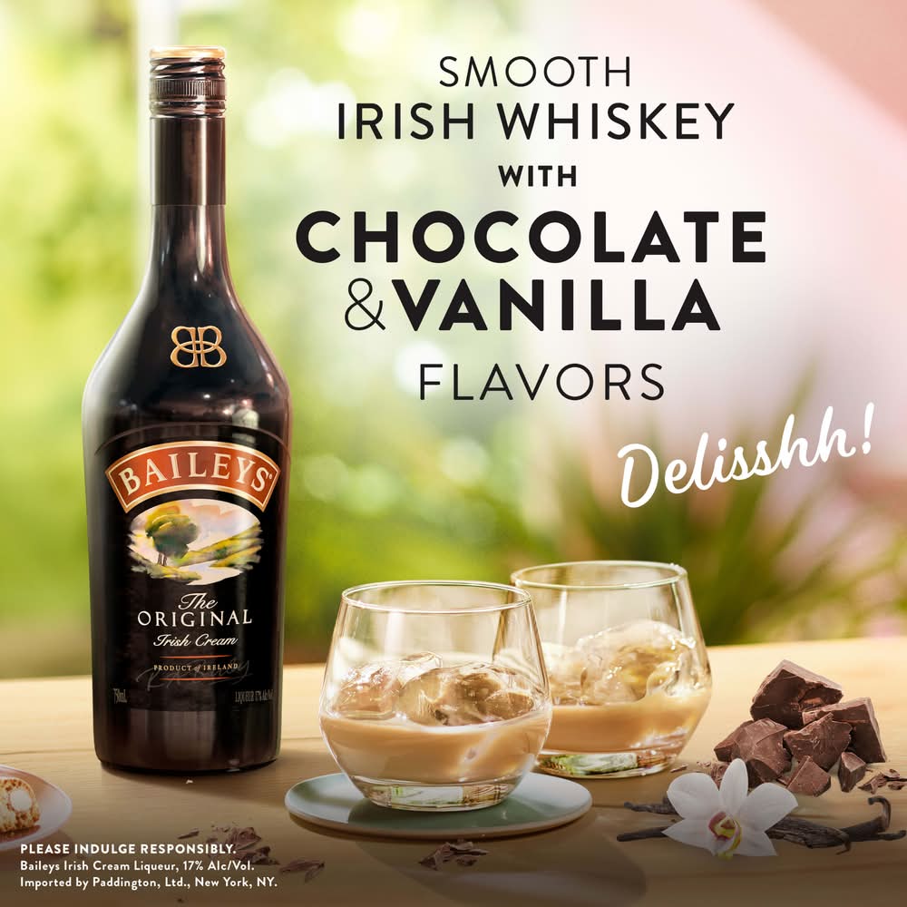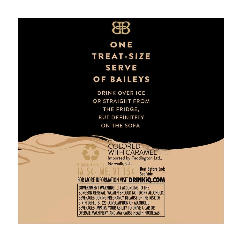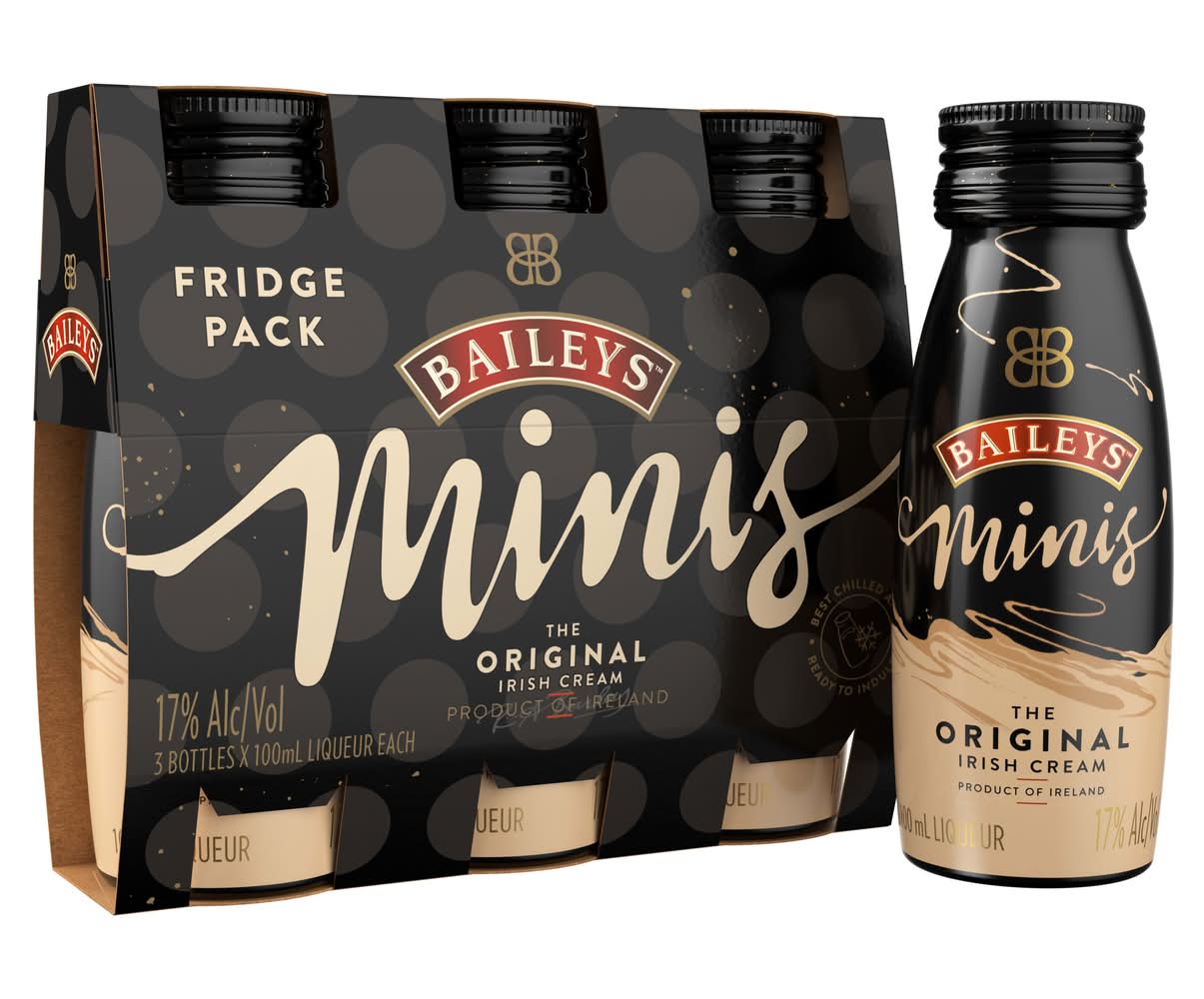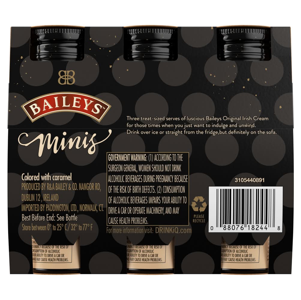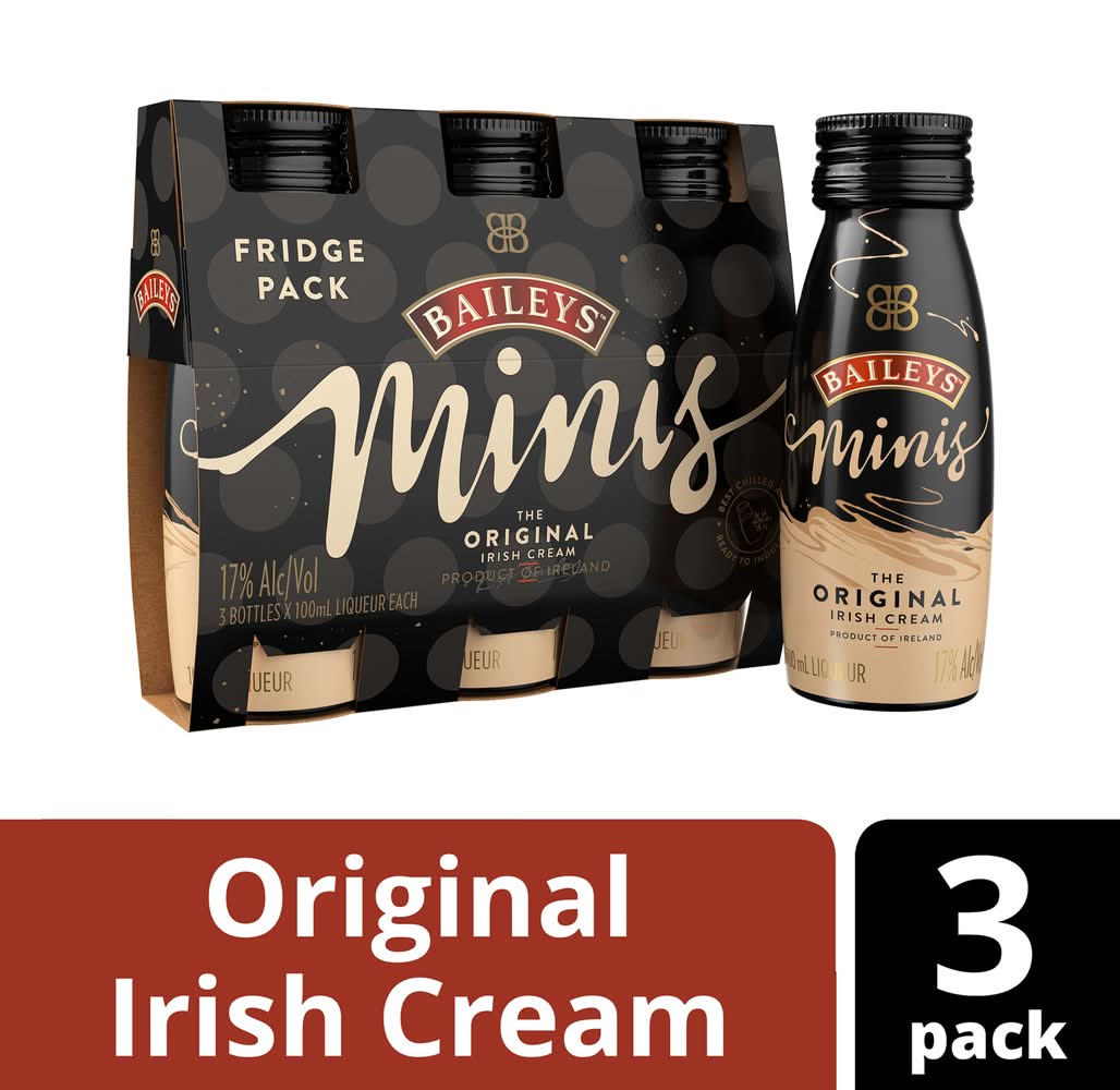 Our 34 proof liqueur is the perfect marriage of premium Irish dairy cream and a unique chocolate and vanilla blend for a decadent taste. The blend of spirits and whiskey uniquely preserves the classic taste of the Irish cream and is great with cocktails and desserts. Best enjoyed in a spiked coffee cocktail. Includes three 100 mL Baileys Minis The Original Irish Cream. Please drink responsibly. • Flavor: Rich chocolate-vanilla • Pack size: 3 • Alcohol by volume: 17%