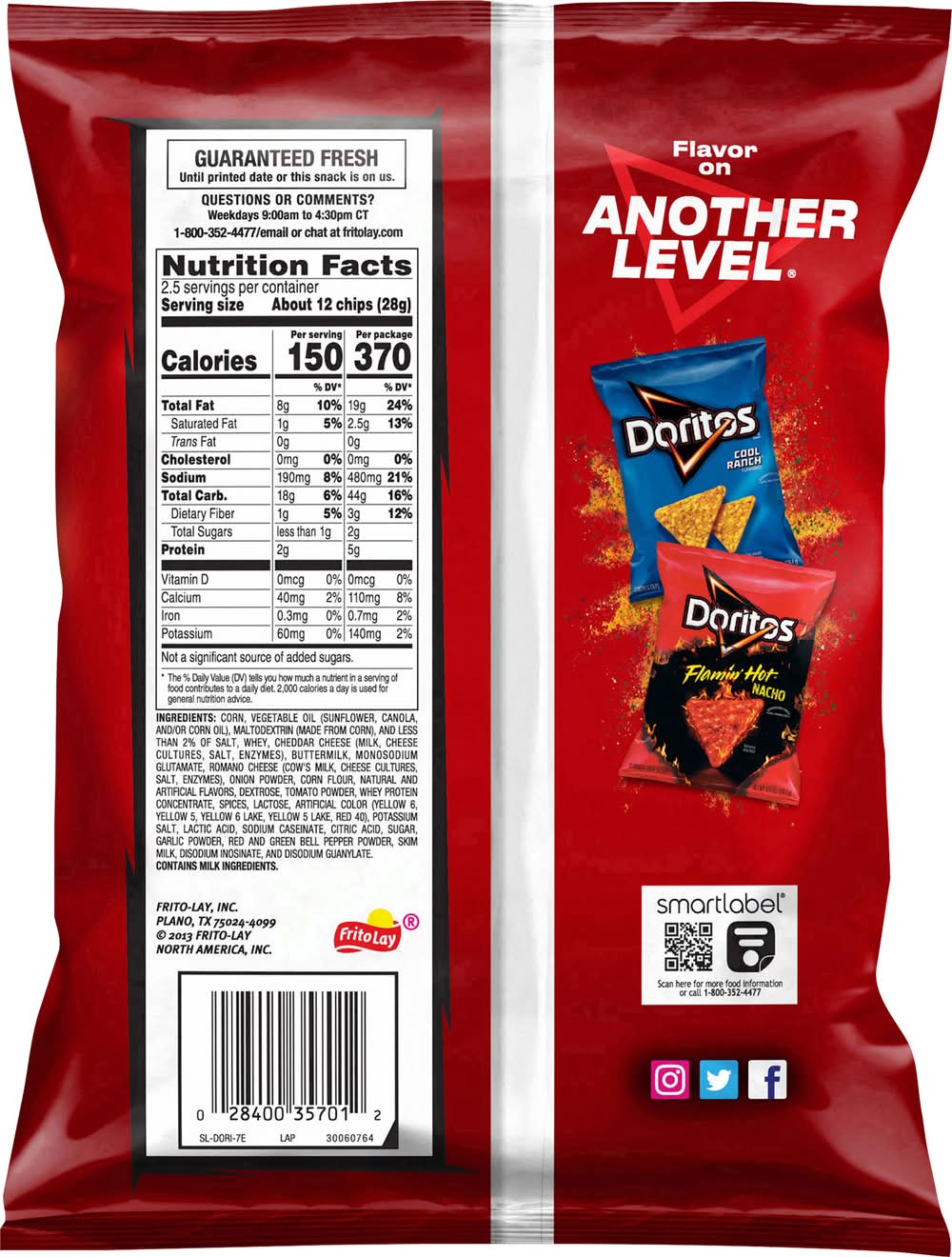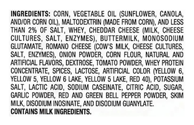 Ingredients: Corn, Vegetable Oil (Sunflower, Canola, and/or Corn Oil), Maltodextrin (Made from Corn), and Less than 2% of Salt, Whey, Cheddar Cheese (Milk, Cheese Cultures, Salt, Enzymes), Buttermilk, Monosodium Glutamate, Romano Cheese (Cow's Milk, Cheese Cultures, Salt, Enzymes), Onion Powder, Corn Flour, Natural and Artificial Flavors, Dextrose, Tomato Powder, Whey Protein Concentrate, Spices, Lactose, Artificial Color (Yellow 6, Yellow 5, Yellow 6 Lake, Yellow 5 Lake, Red 40), Potassium Salt, Lactic Acid, Sodium Caseinate, Citric Acid, Sugar, Garlic Powder, Red and Green Bell Pepper Powder, Skim Milk, Disodium Inosinate, and Disodium Guanylate Contains: Milk, Lactose