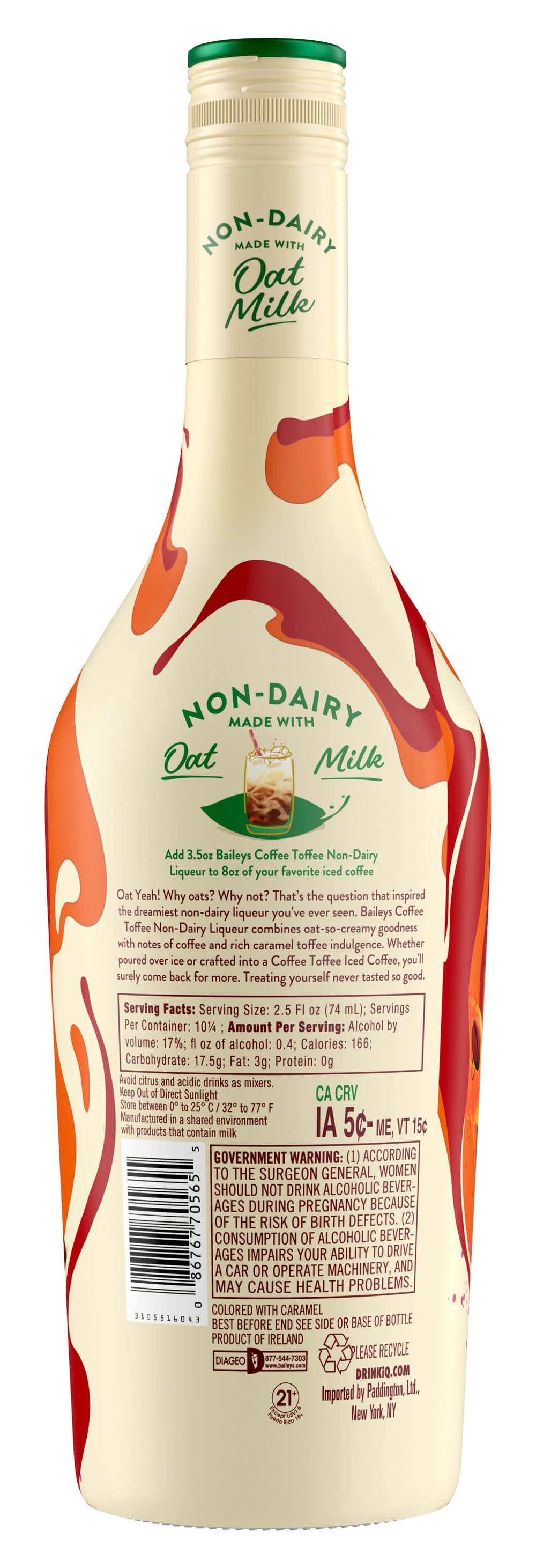 Baileys Non-Dairy Liqueur Made with Oat Milk in decadent Coffee Toffee flavor. Smooth Irish whiskey, fine spirits, and luscious oat milk combine with notes of coffee and rich caramel toffee for an unapologetically delicious Baileys that’s so indulgent it doesn’t need dairy. More than a little treat, it’s the creamy indulgence you know and expect from Baileys, with a dairy-free twist. Try this on-trend flavor in hot or iced coffee, in an elevated brunch cocktail, or on its own for a truly adult treating moment. Includes one 34 proof bottle of Baileys Non-Dairy Liqueur Made with Oat Milk in Coffee Toffee. Please drink responsibly. • Alcohol by volume: 17% • Packaging: Reusable