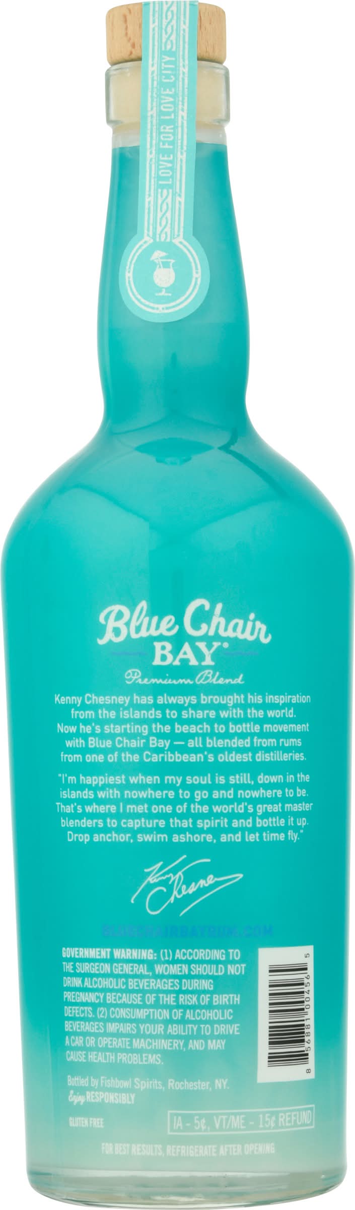 Caribbean rum with real cream and coconut flavors. Gluten free. Love for Love City. There's a blue rocking chair sitting in the sand weathered by the storms and well oiled hands it sways back and forth with the help of the winds and seems to always be there like an old trusted friend. Kenny Chesney has always brought his inspiration from the islands to share with the world. Now he's starting the beach to bottle movement with Blue Chair Bay - all blended from rums from one of the Caribbean's oldest distilleries. I'm happiest when my soul is still, down in the islands with nowhere to go and nowhere to be. That's where I met one of the world's great master blenders to capture that spirit and bottle it up. Drop anchor, swim ashore, and let time fly. - Kenny Chesney. Enjoy responsibly. • Flavor: Assorted • Alcohol by volume: 15% • Fishbowl Spirits, Rochester, NY