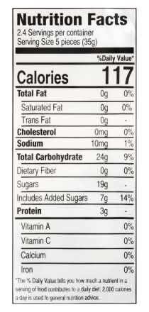 Ingredients: Glucose Syrup, Sugar, Beef Gelatine (Halal), Fruit Juice Concentrate (1.66 %), Acidity Regulator (Citric Acid), Glazing Agent (Vegetable Oil *Palm Kernel, Carnauba Wax, Bees Wax), Artificial Flavors, Color (FD&C Blue No.1)