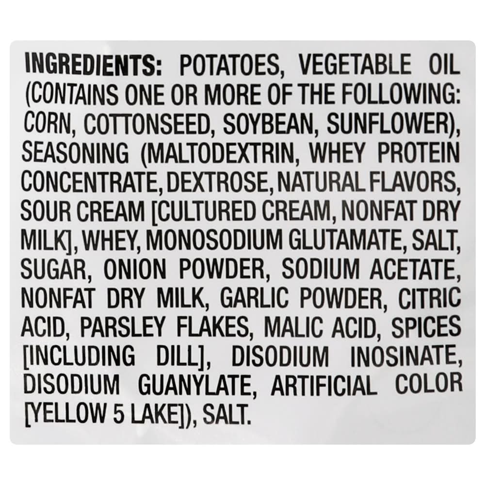 Ingredients: Potatoes, Vegetable Oil (Contains One or More of the Following: Corn, Cottonseed, Soybean, Sunflower), Seasoning (Maltodextrin, Whey Protein Concentrate, Dextrose, Natural Flavors, Sour Cream [Cultured Cream, Nonfat Dry Milk], Whey, Monosodium Glutamate, Salt, Sugar, Onion Powder, Sodium Acetate, Nonfat Dry Milk, Garlic Powder, Citric Acid, Parsley Flakes, Malic Acid, Spices [Including Dill], Disodium Inosinate, Disodium Guanylate, Artificial Color [Yellow 5 Lake]), Salt Contains: Milk, Soybeans