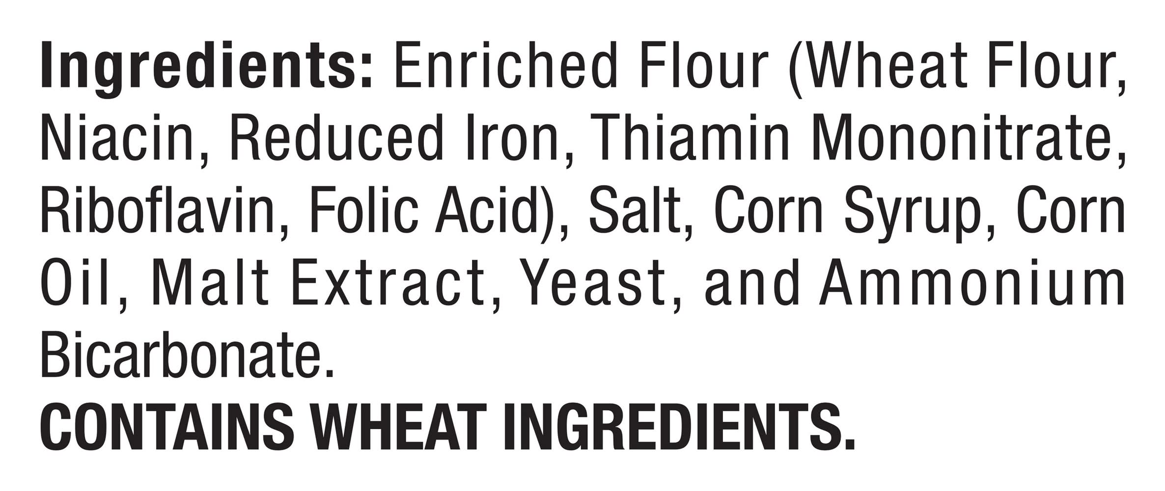 Ingredients: Enriched Flour (Wheat Flour, Niacin, Reduced Iron, Thiamin Mononitrate, Riboflavin, Folic Acid), Salt, Corn Syrup, Corn Oil, Malt Extract, Yeast, and Ammonium Bicarbonate Contains: Wheat, Corn