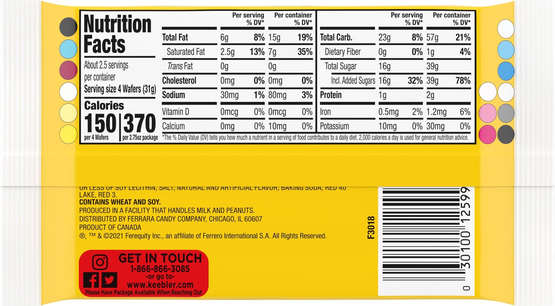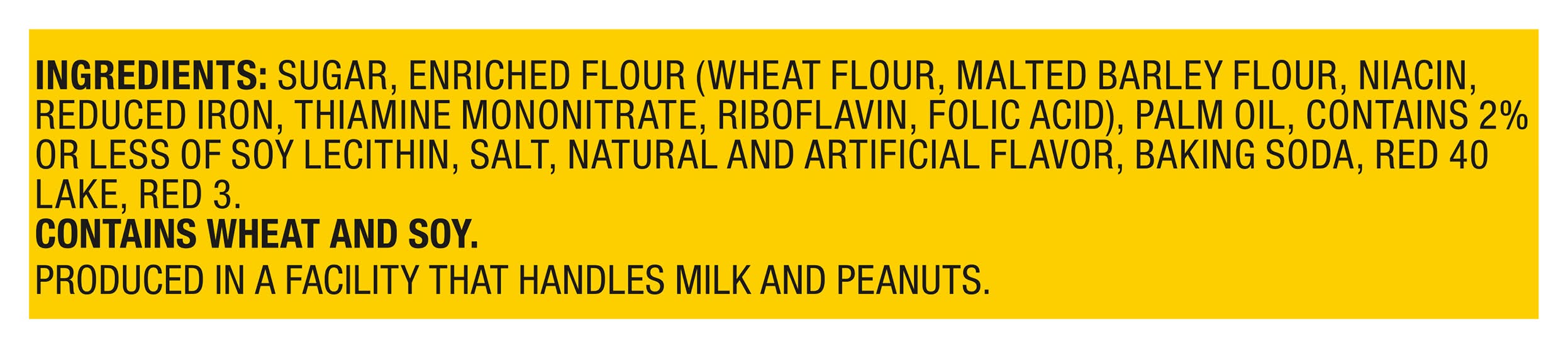Ingredients: Sugar, Enriched Flour (Wheat Flour, Malted Barley Flour, Niacin, Reduced Iron, Thiamine Mononitrate, Riboflavin, Folic Acid), Palm Oil, Contains 2% or Less of Soy Lecithin, Salt, Natural and Artificial Flavor, Baking Soda, Red 40 Lake, Red 3 Contains: Wheat, Soybeans, Barley, Milk, Peanuts