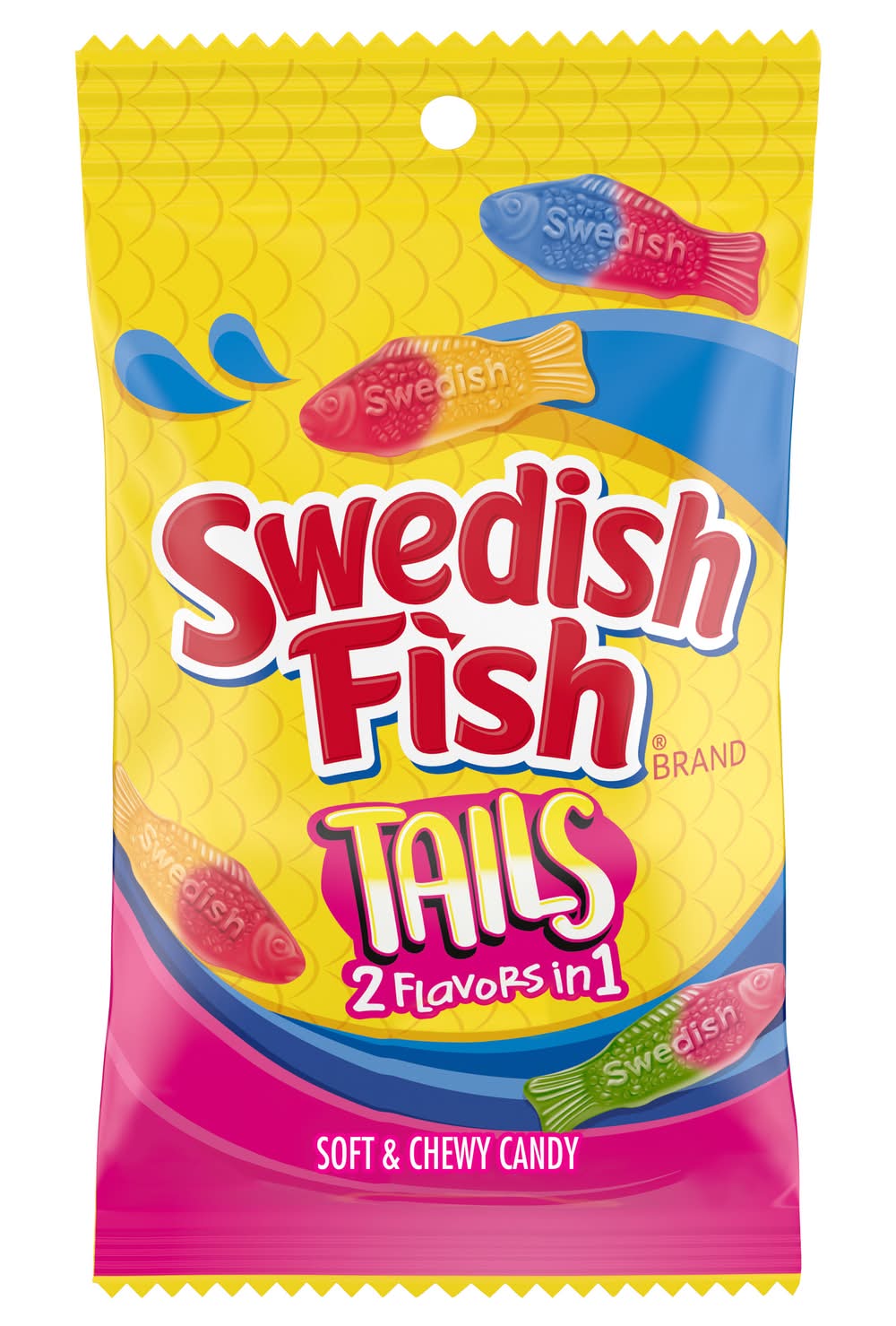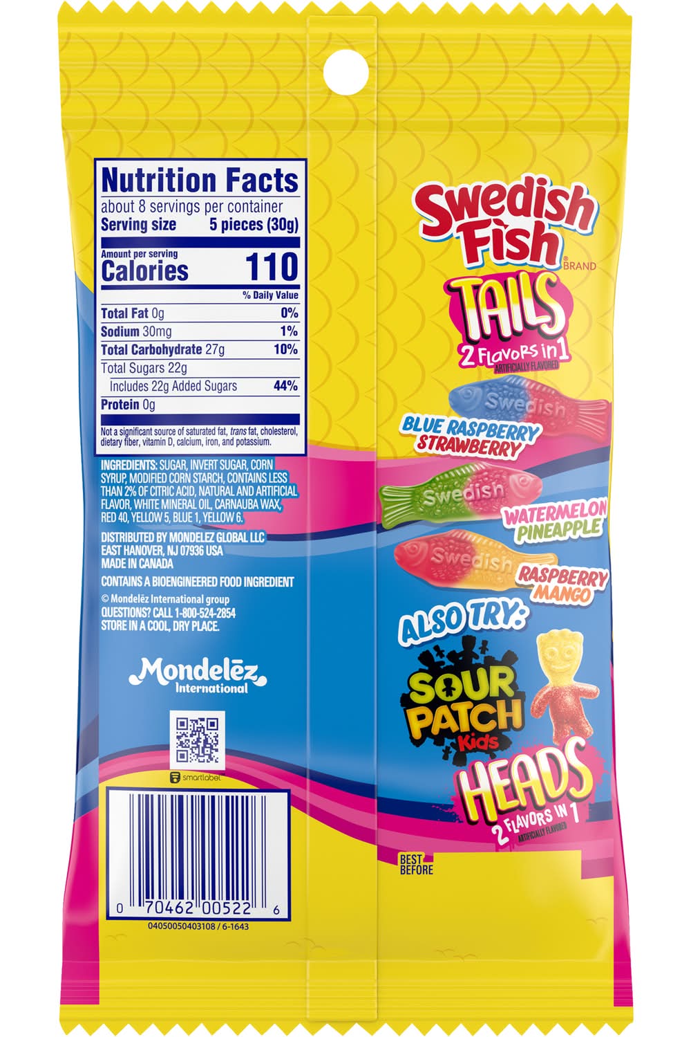 SWEDISH FISH Tails 2 Flavors in 1 Soft & Chewy Candy doubles up on the deliciousness with two flavors in each sweet candy piece. With three different flavor combinations, including blue raspberry strawberry, watermelon pineapple and raspberry mango, your taste buds will be swimming with flavor in every bite. The classic fish shape in bright colors adds a bit of excitement to your candy experience, no matter what the occasion. A fat free food, this fruit flavored candy adds a bit of excitement to your candy experience, no matter what the occasion. Keep SWEDISH FISH gummy snacks on-hand for quick snacks or as party favors for holidays or birthdays. This soft candy also makes a tasty movie theater candy to snack on during your favorite flick. Each package of bagged candy is the perfect size for storing in your purse, backpack or lunchbox for grab-and-go chewy snacks. Mondelez Global LLC, East Hanover, NJ, 07936