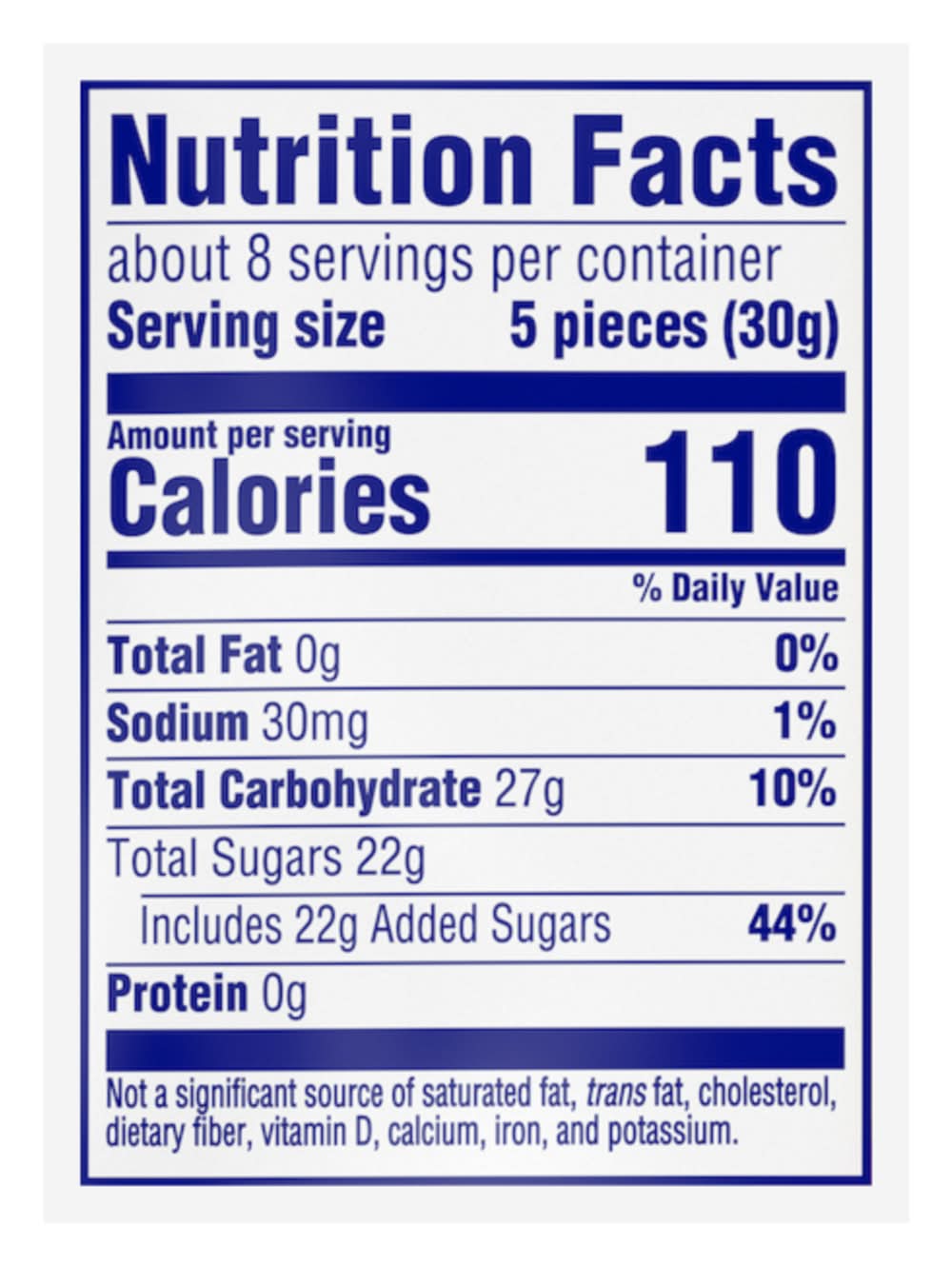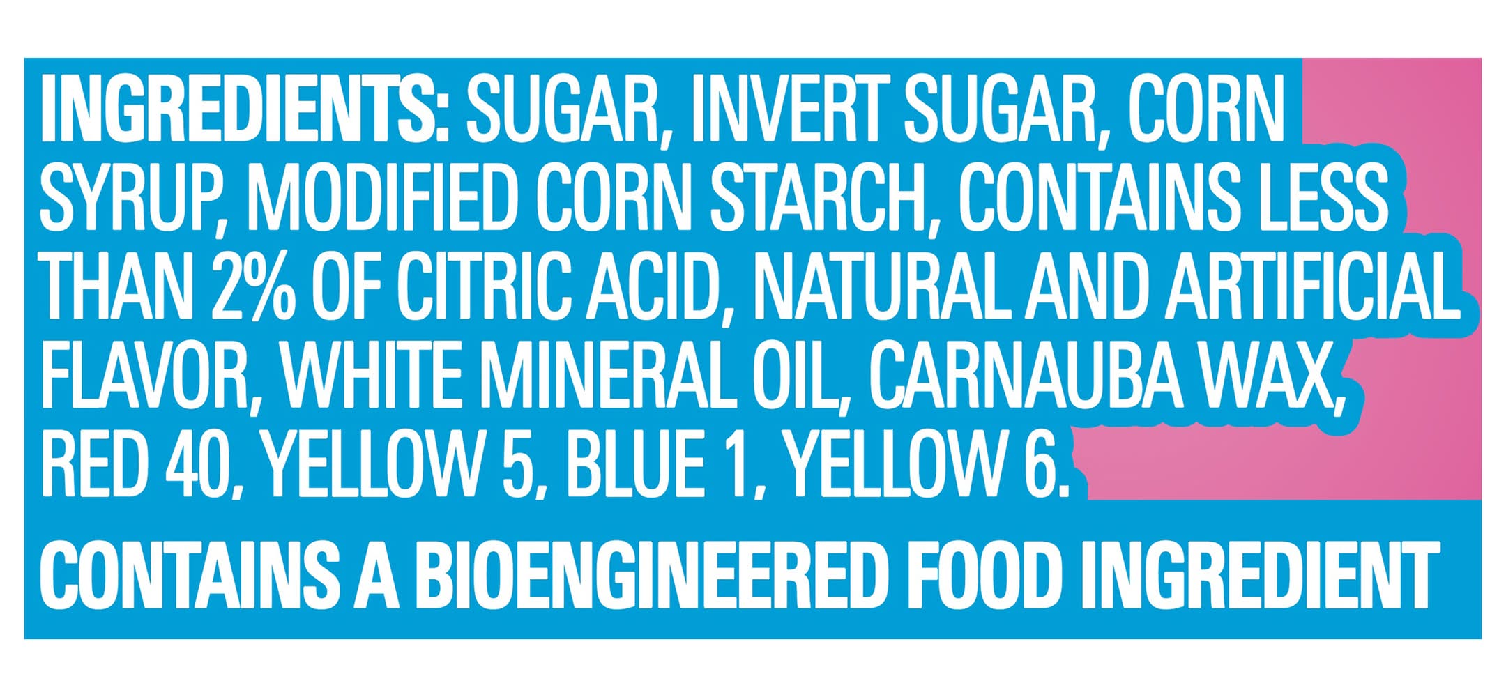 Ingredients: INGREDIENTS: SUGAR, INVERT SUGAR, CORN SYRUP, MODIFIED CORN STARCH, CONTAINS LESS THAN 2% OF CITRIC ACID, NATURAL AND ARTIFICIAL FLAVOR, WHITE MINERAL OIL, CARNAUBA WAX, RED 40, YELLOW 5, BLUE 1, YELLOW 6. Contains: Corn