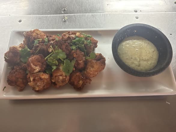 White Cheddar Cheese Curds- Cilantro. Served with Poblano Cream