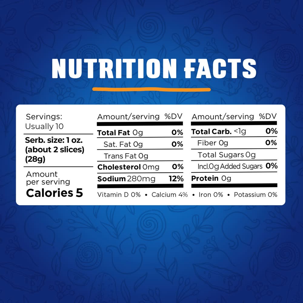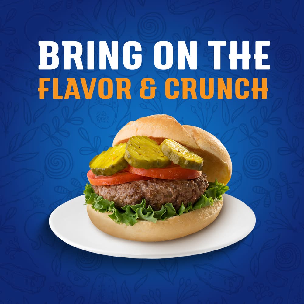 The are deliciously crunchy and offer classic dill flavor. all ingredients, along with the pickling recipe, make these hamburger dill chips one of a kind. oval pickles are perfect for adding to deli sandwiches. pile these dill pickle chips on hamburgers, top fresh salads, or eat them right from the jar as a satisfying snack. to keep them crunchy and delicious. offers several flavors and sizes of pickles, peppers and relish. keto friendly and 0g added sugar per serving. • Conagra Brands, PO Box 3534, Chicago, IL, 60654 • Packaging: Reusable